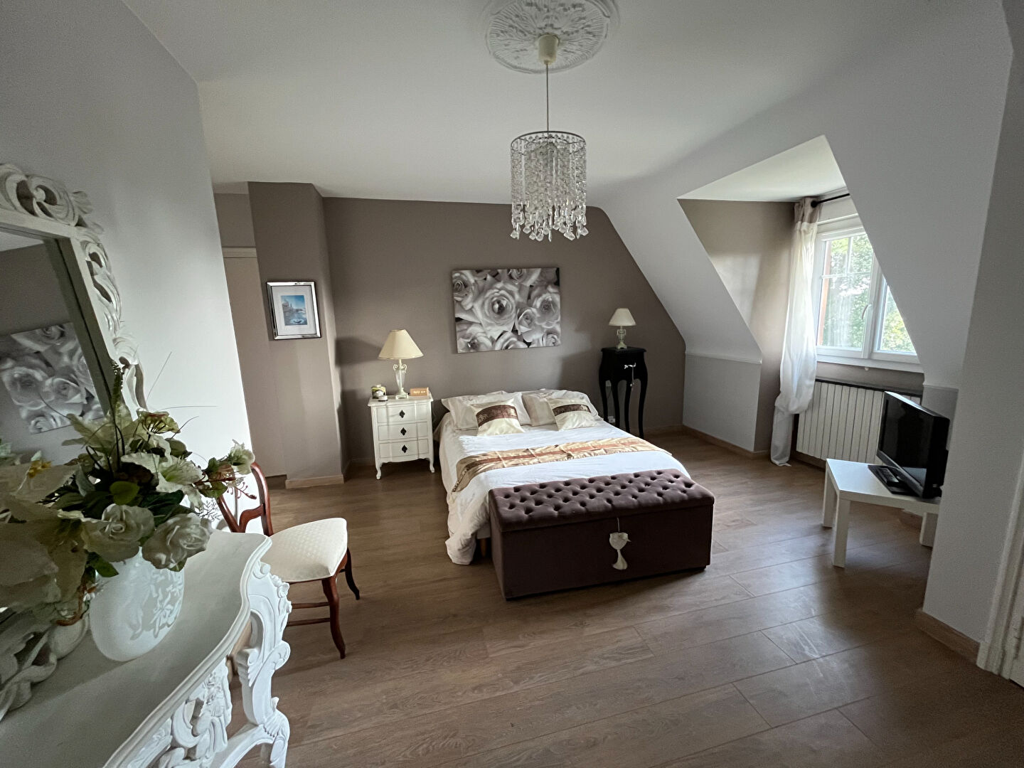 La pièce de réception aux volumes généreux s'ouvre sur une terrasse exposée plein sud, parfaitement intime.
