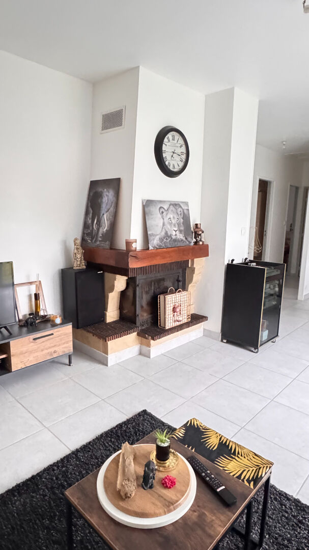 Entrée avec placard - cuisine aménagée - séjour salon avec cheminée et balcon - salle d'eau avec meuble sur vasque - deux chambres.