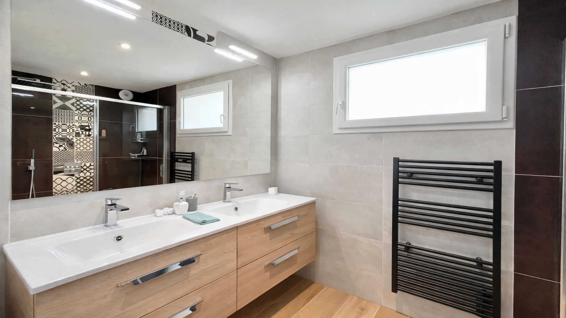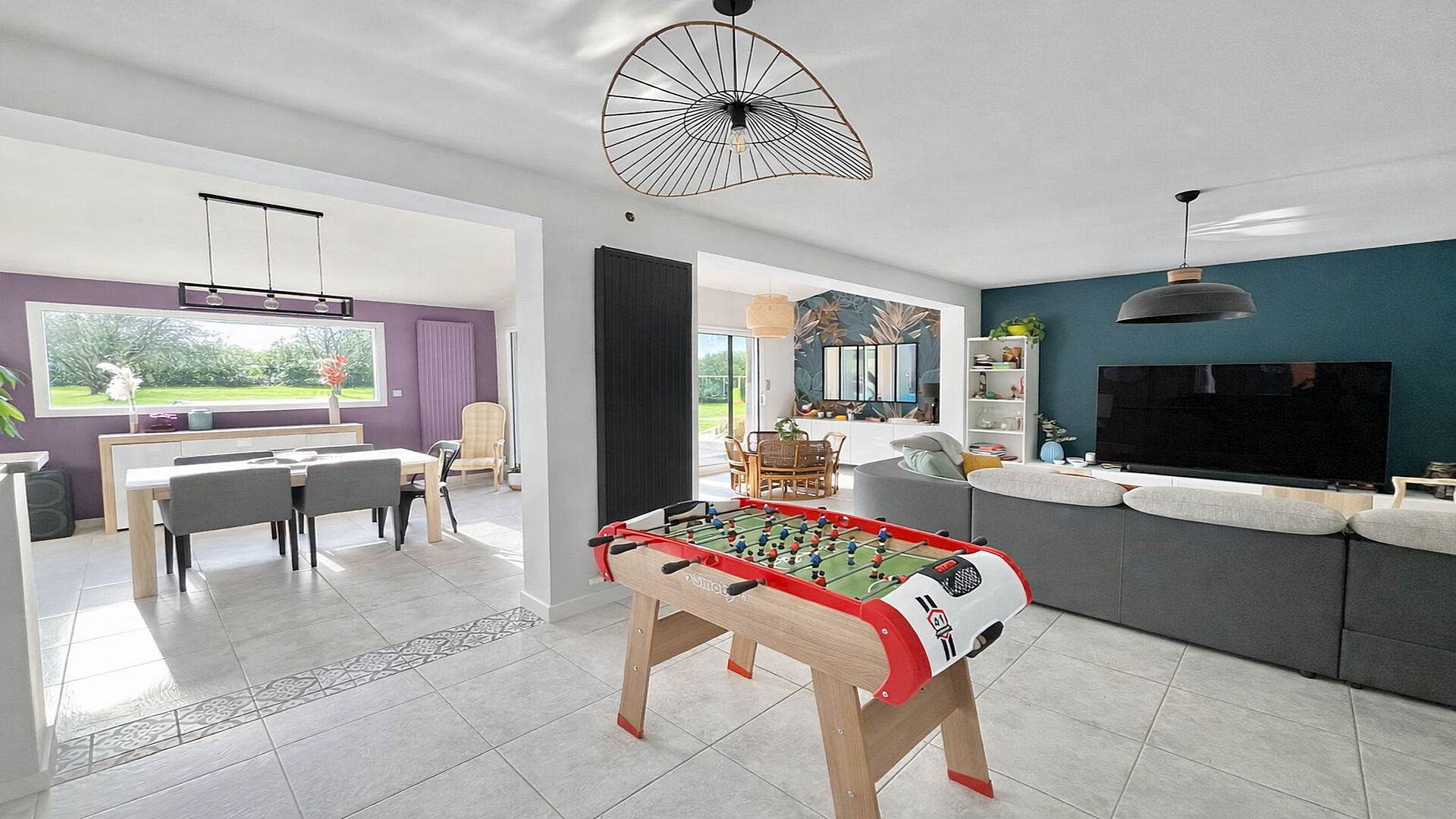 Le rez-de-chaussée s'ouvre sur un vaste salon-séjour d'environ 60 m², baigné de lumière et pensé pour recevoir dans une atmosphère chaleureuse et contemporaine. Une cuisine moderne, entièrement équipée et aménagée avec soin, complète cet espace de vie convivial.