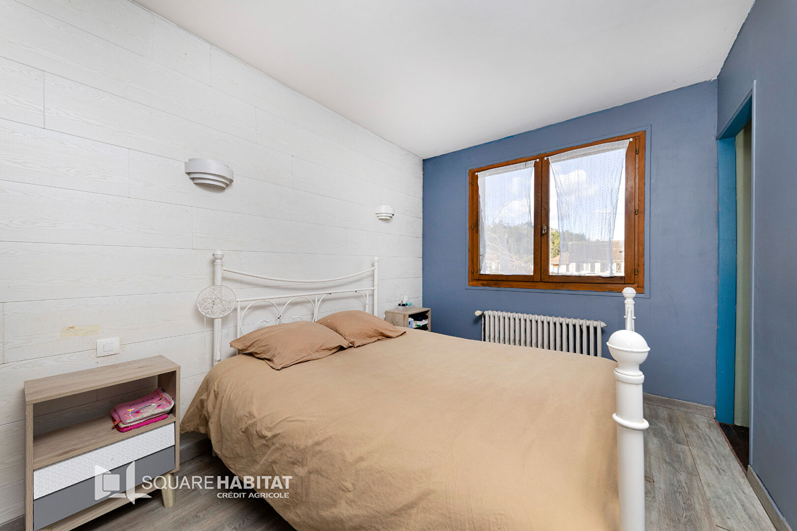 Sous-sol surélevé comprenant une chambre aménagée et un garage.