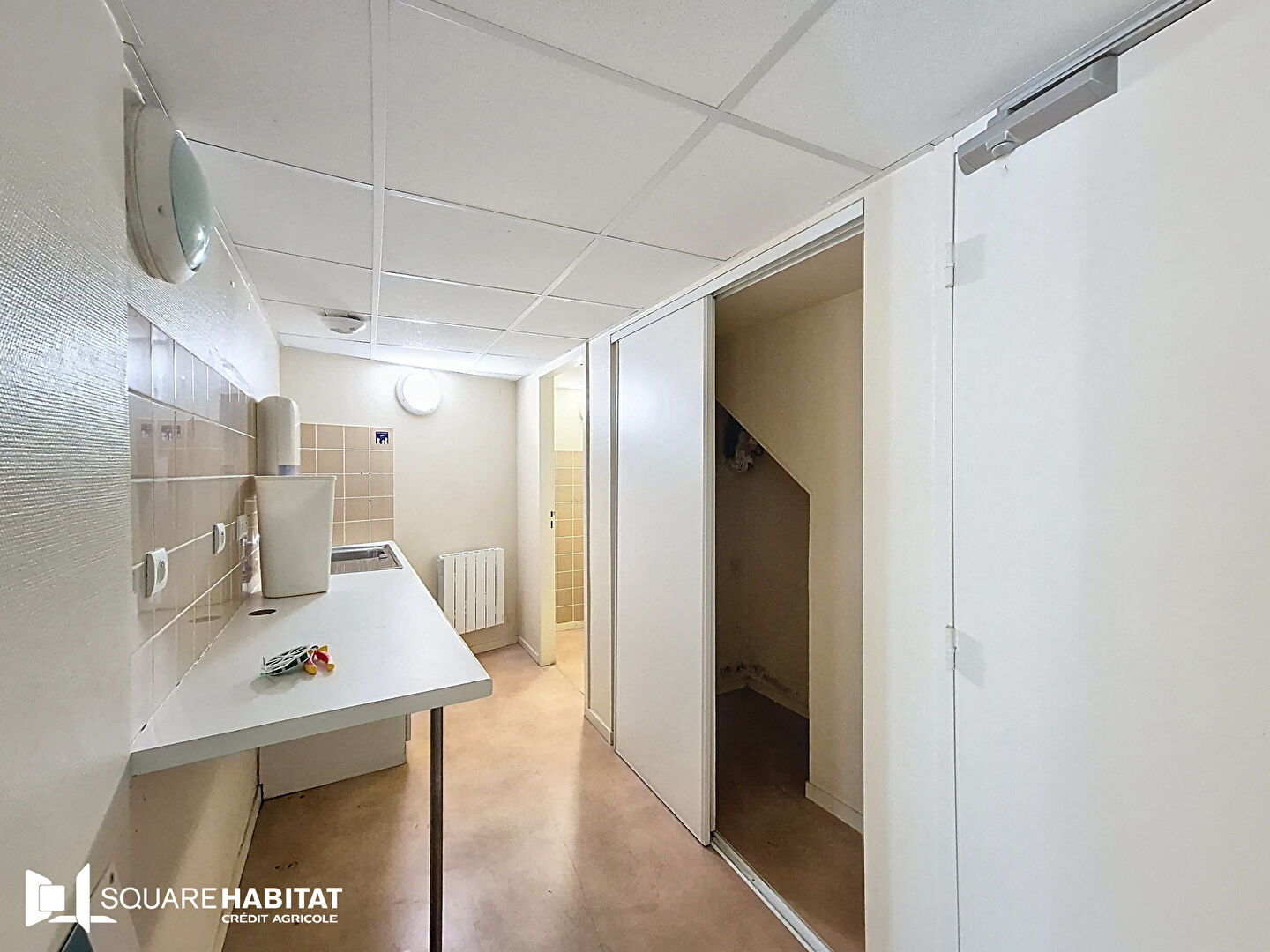 Au rez-de-chaussée, vous trouverez : un hall d'accueil, une salle d'attente, un bureau, un local technique, une pièce à usage de chambre forte, un espace dédié au personnel ainsi que des sanitaires.