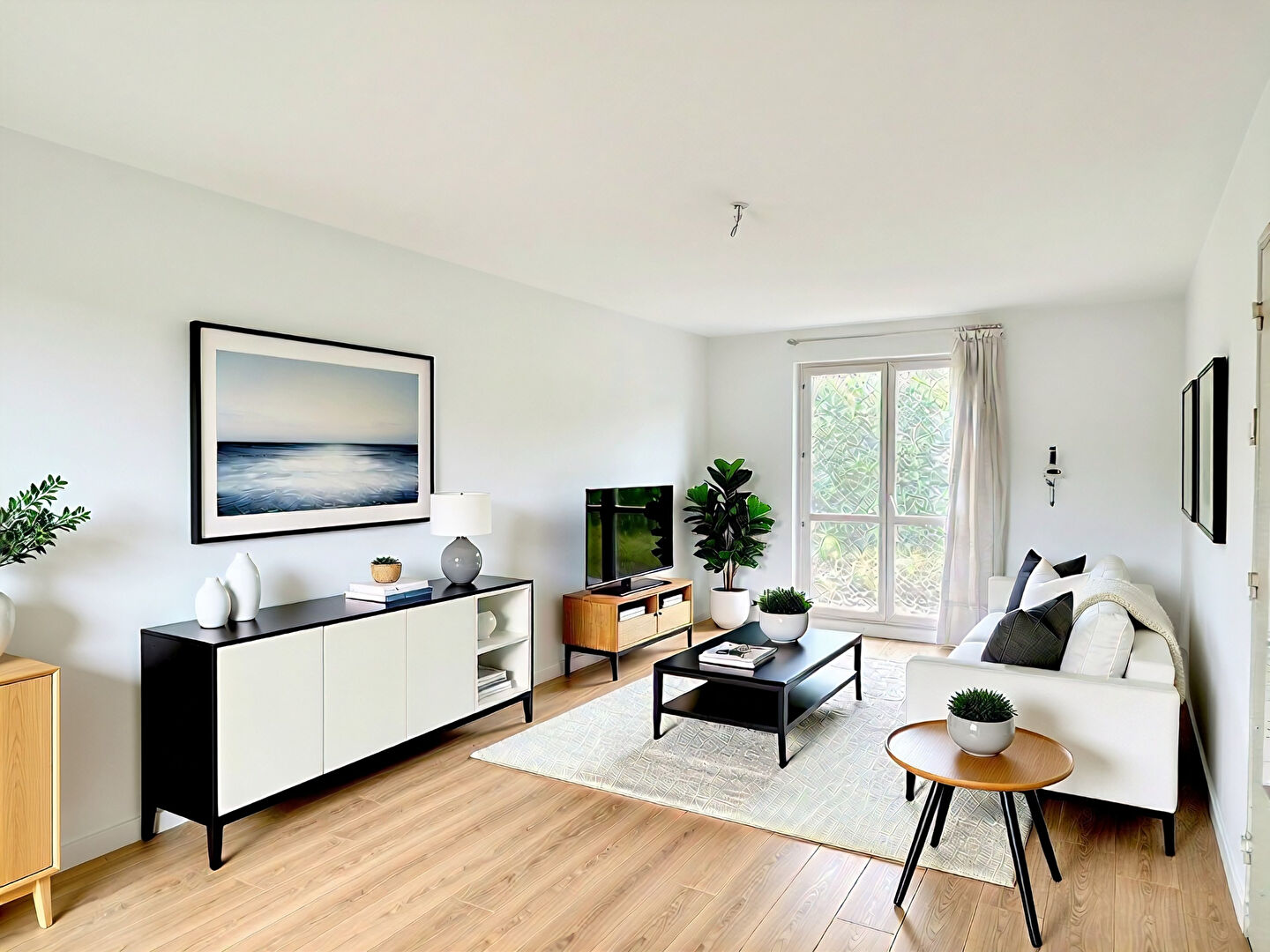 Pièce de vie traversante, cuisine indépendante, deux chambres avec placard, un cellier, et un garage.