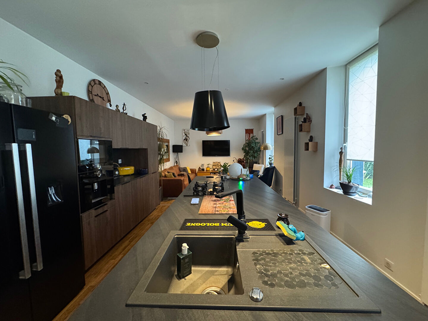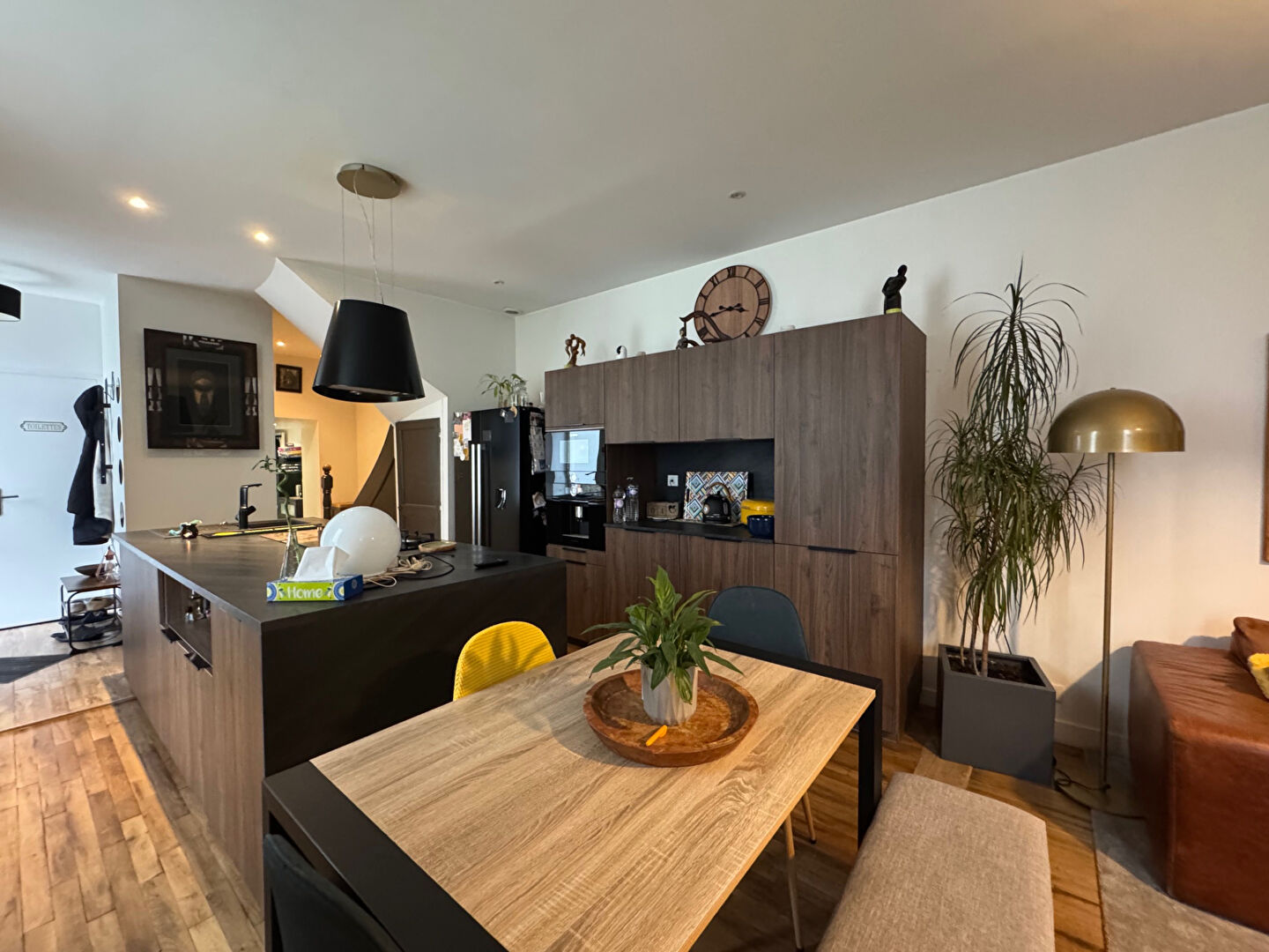 Dès l'entrée, vous découvrez un espace fonctionnel avec toilettes indépendantes. La cuisine aménagée et équipée, dotée d'un îlot central, s'ouvre sur un agréable séjour, idéal pour recevoir.