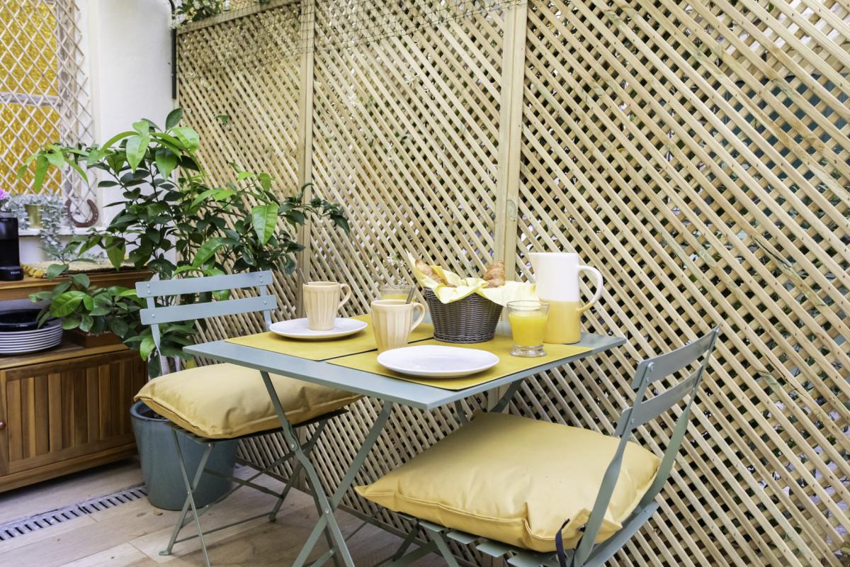 Situé au 1er étage, avec ascenseur, sa terrasse sur cour de 15m² orientée Sud, longe à la fois le séjour et la chambre. L'appartement et sa terrasse tout en étant au centre ville profitent d'un calme exceptionnel.