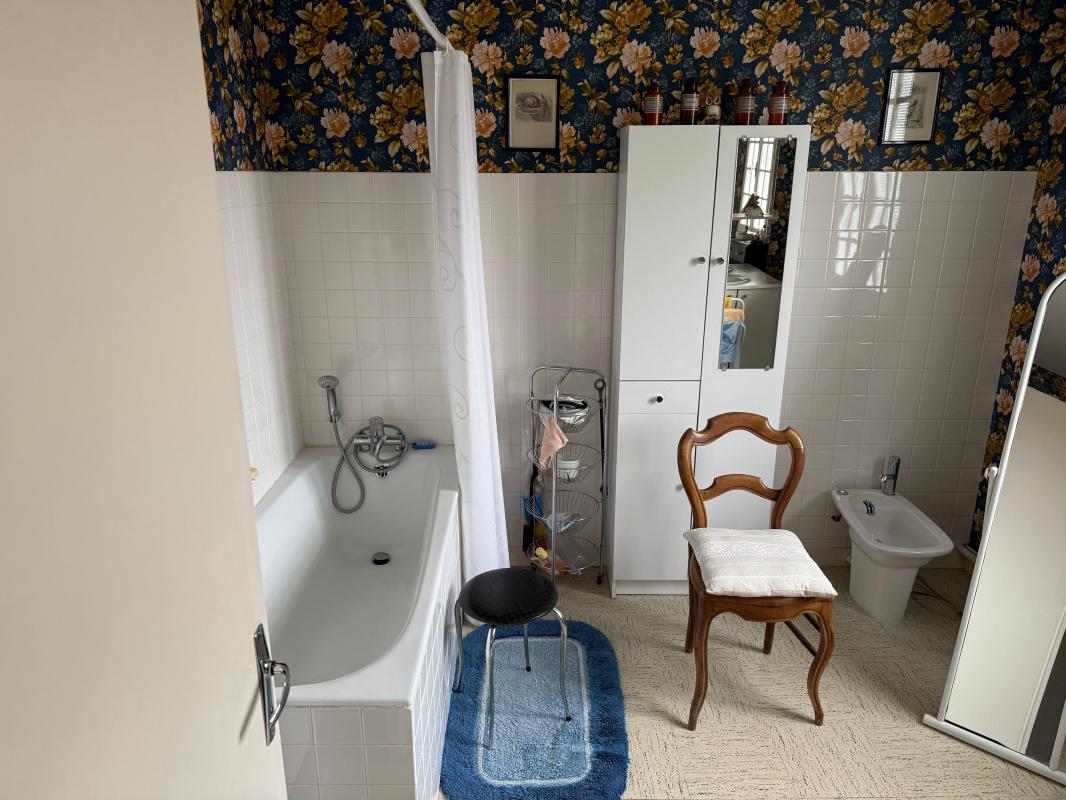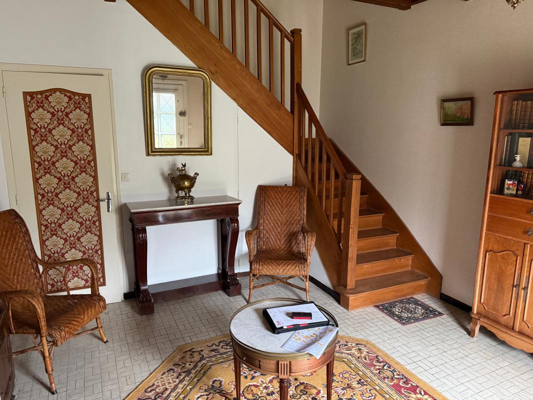 A l'étage un palier avec degagement, trois chambres avec placard, une salle de bains, un WC et un grenier.