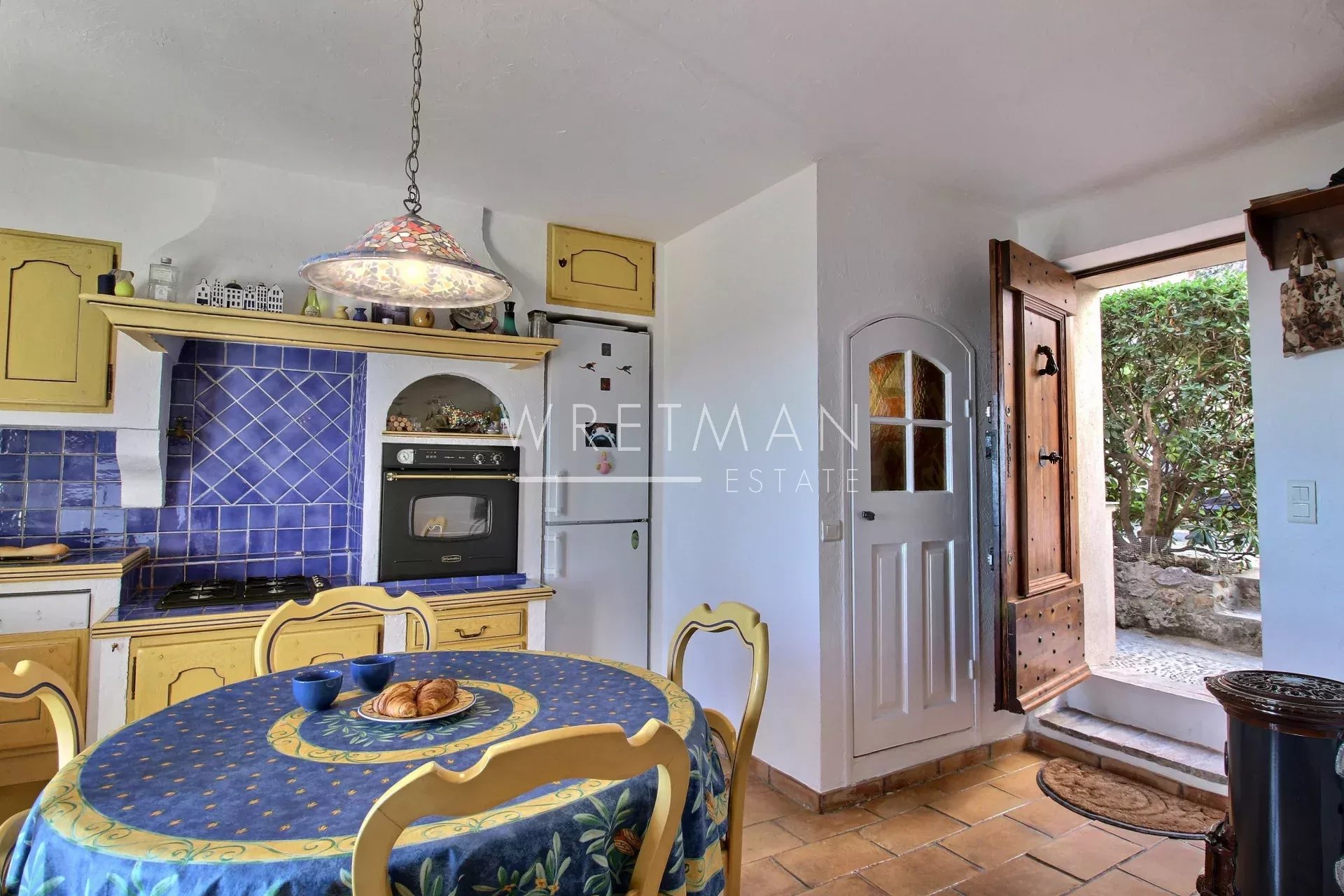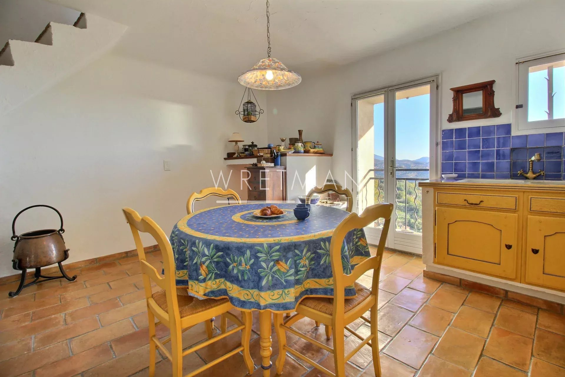 Au premier étage, le salon, chaleureux et accueillant, s’ouvre sur un balcon couvert offrant une vue panoramique sur la mer. Un escalier vous conduira à la terrasse tropézienne sur le toit.