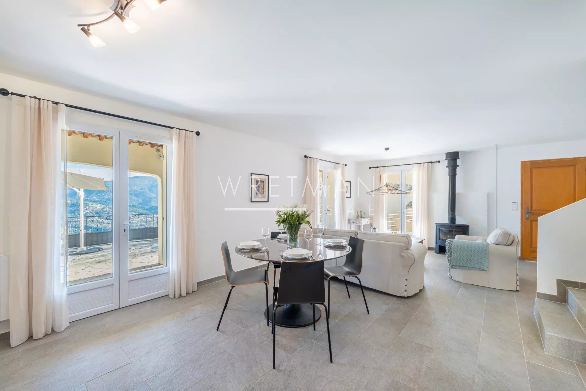 Au rez-de-jardin, l'entrée s'ouvre sur une cuisine moderne et entièrement équipée, prolongée par un vaste salon et une salle à manger baignés de lumière. Ces espaces de vie s'étendent harmonieusement vers une terrasse et la piscine, où vous pourrez profiter d’une vue exceptionnelle. Ce niveau dispose également de toilettes invités et d'une buanderie pratique.