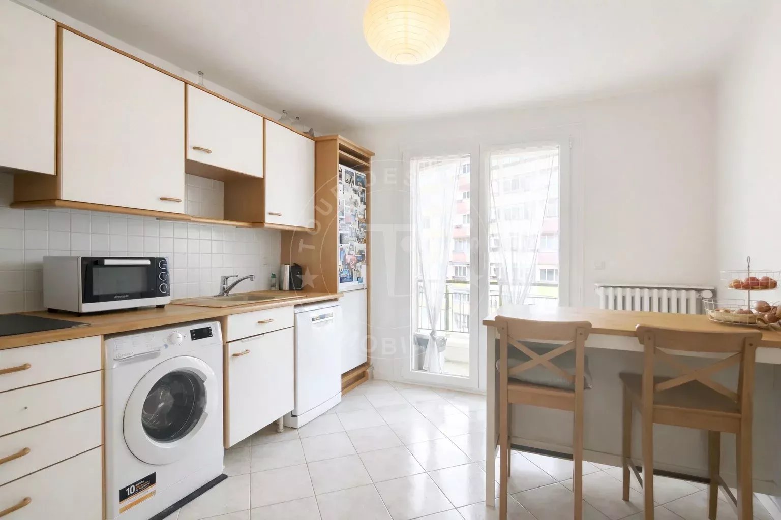 Le séjour s’ouvre sur un balcon exposé sud-ouest, tandis que la cuisine indépendante dispose également d’un accès à un second balcon. Trois chambres, une salle de bains et des WC séparés complètent l’agencement du bien.