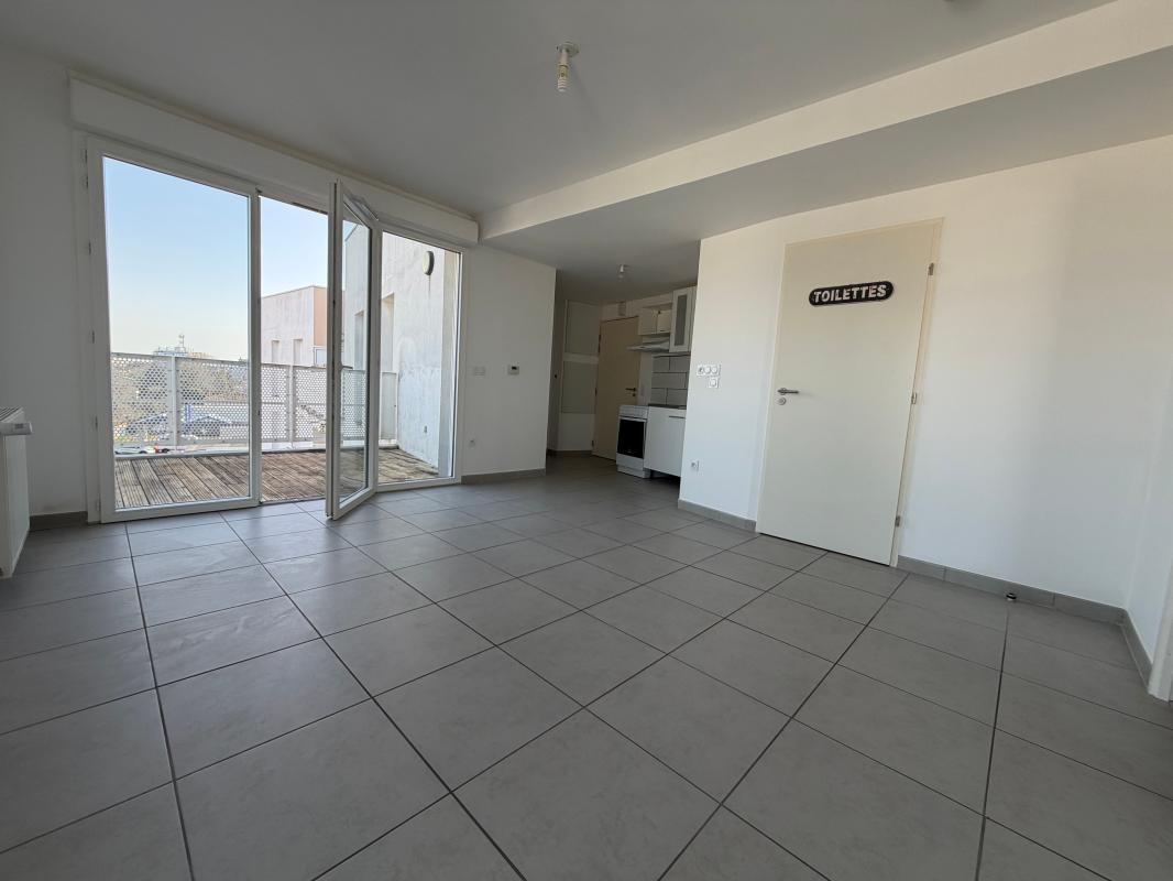 Il comprend une pièce de vie lumineuse avec accès direct à une terrasse de 10 m², une chambre, une cuisine, ainsi qu'une salle d'eau avec WC.
