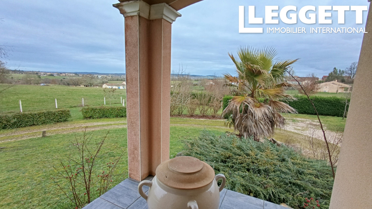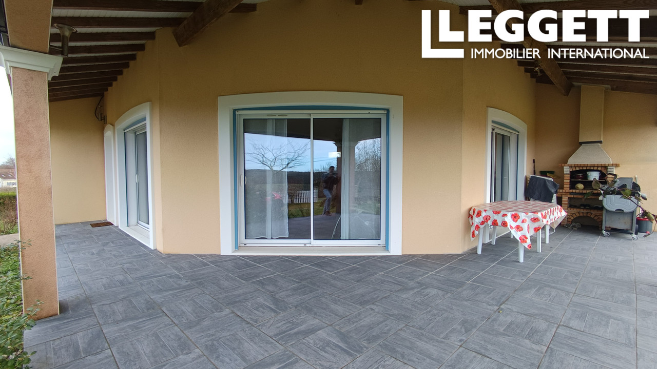 Une grande terrasse domine un jolie jardin avec une vue dégagée sur la campagne environnante.