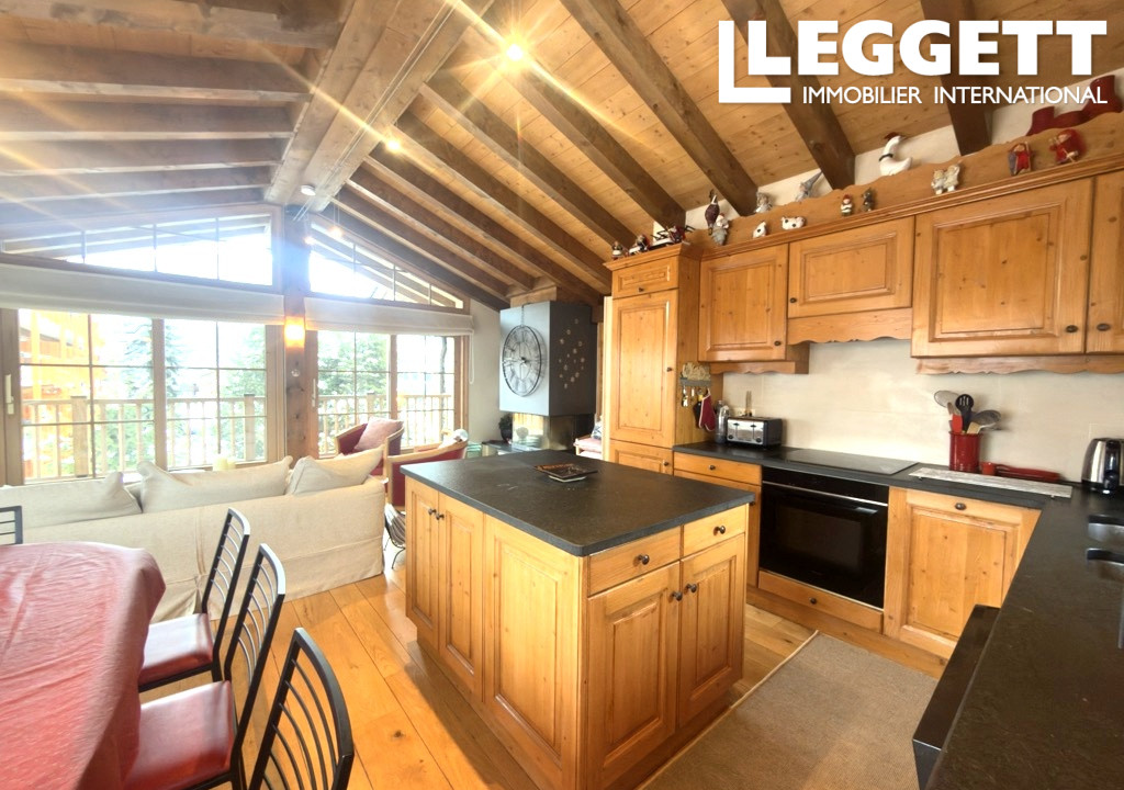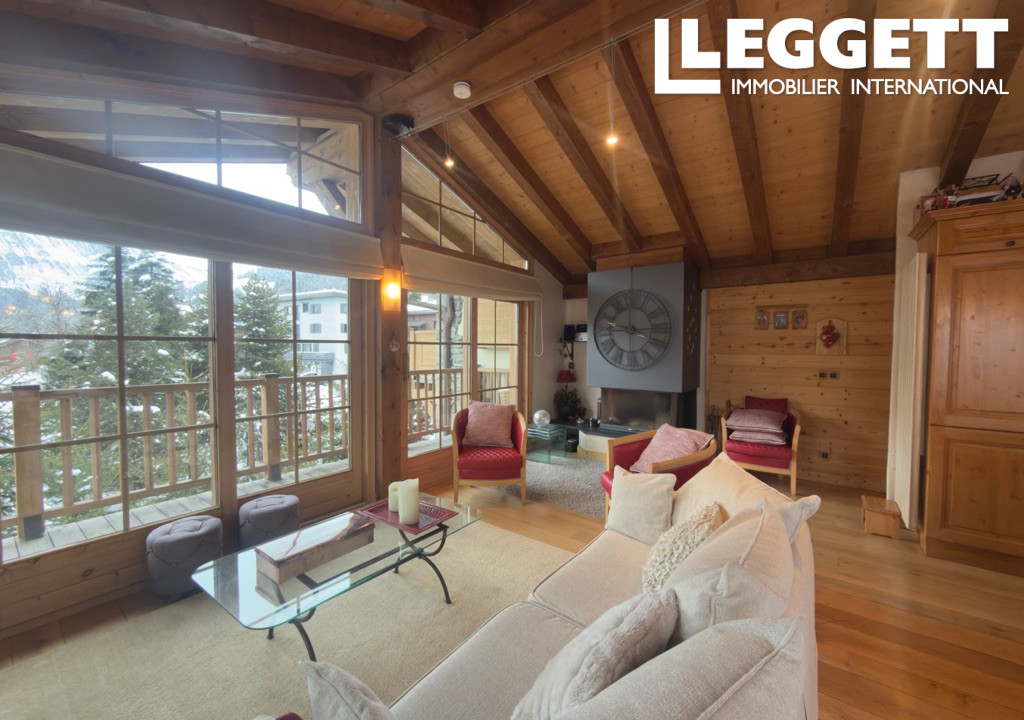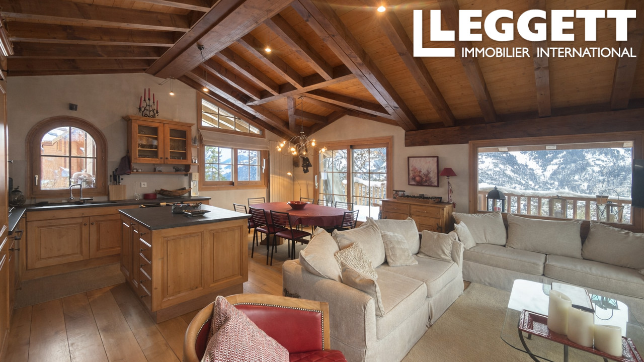 Alliant le charme alpin traditionnel au confort contemporain, le chalet s'articule autour d'une remarquable pièce de vie en double hauteur avec plafond cathédrale, offrant de superbes volumes et une luminosité naturelle généreuse. Cet espace chaleureux se prête aussi bien aux moments de convivialité qu'aux instants de détente après une journée sur les pistes. De larges ouvertures donnent accès à un balcon filant entourant trois façades de la propriété, permettant de profiter de vues panoramiques dégagées sur les sommets environnants et d'un ensoleillement optimal tout au long de la journée.