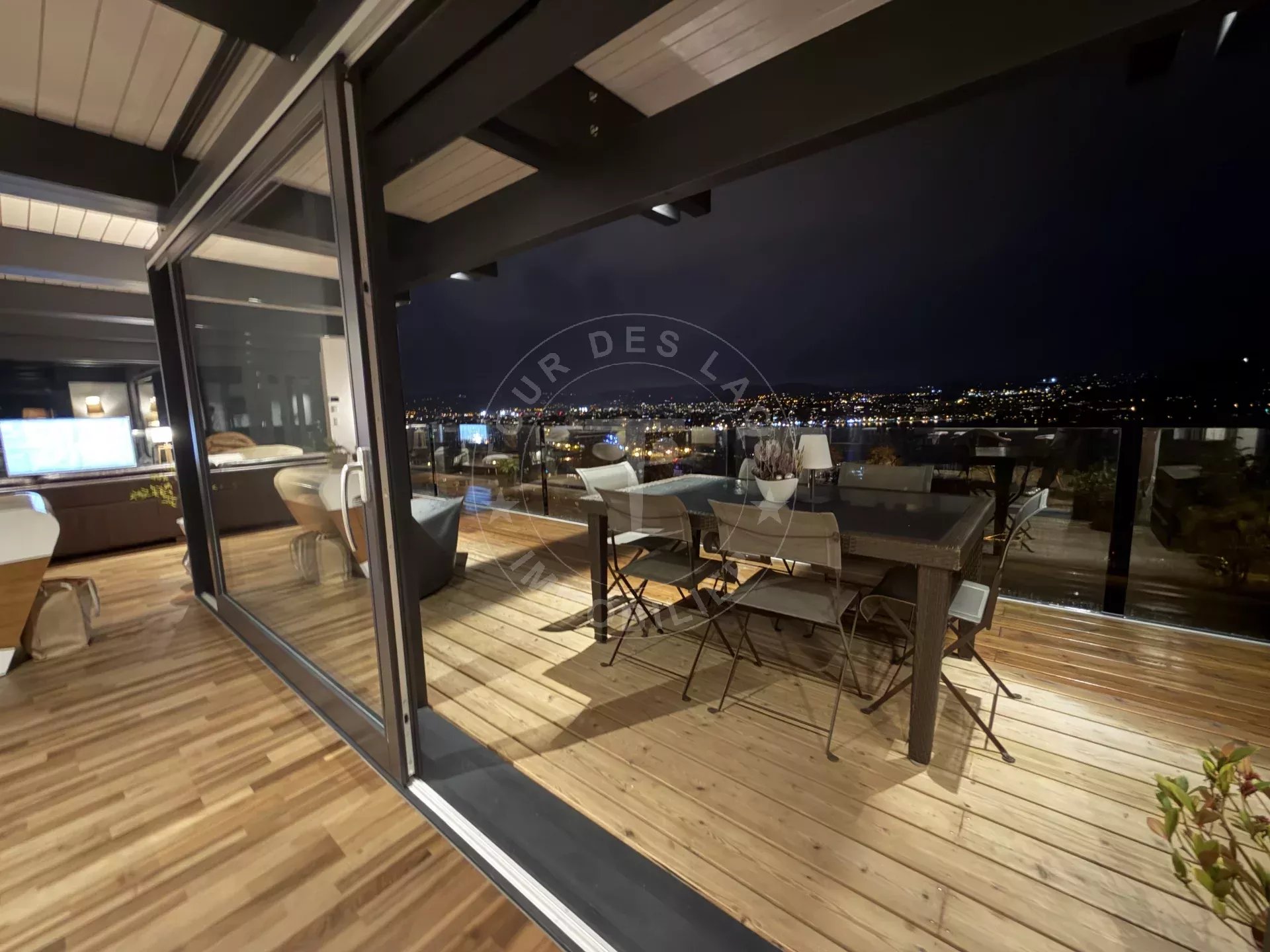 Grâce à ses grandes baies vitrées, elle est baignée de lumière toute la journée ! Sa pièce à vivre d'environ 95 m² se compose d'un salon, d'une salle à manger et d'une cuisine moderne entièrement équipée avec son îlot central et sa cave à vin pour un maximum de convivialité. Depuis ce niveau, vous pourrez accéder à une terrasse face au lac.