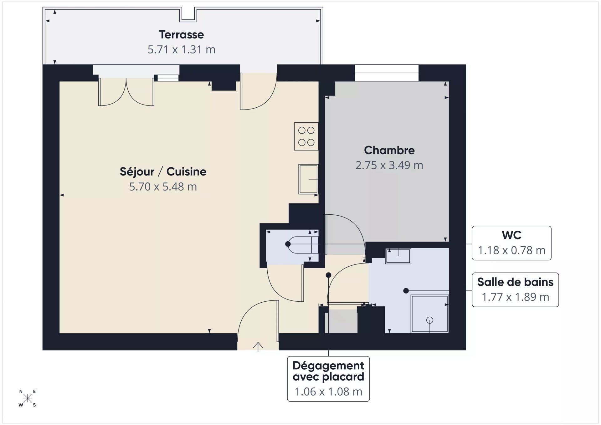 L'appartement est bien agencé et offre un séjour/cuisine de 27 m² ouvrant sur une terrasse de 7 m² donnant sur un parc, une chambre au calme, salle de douche et WC séparé.