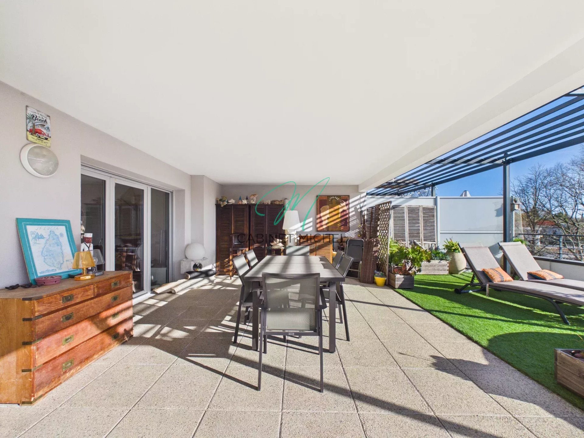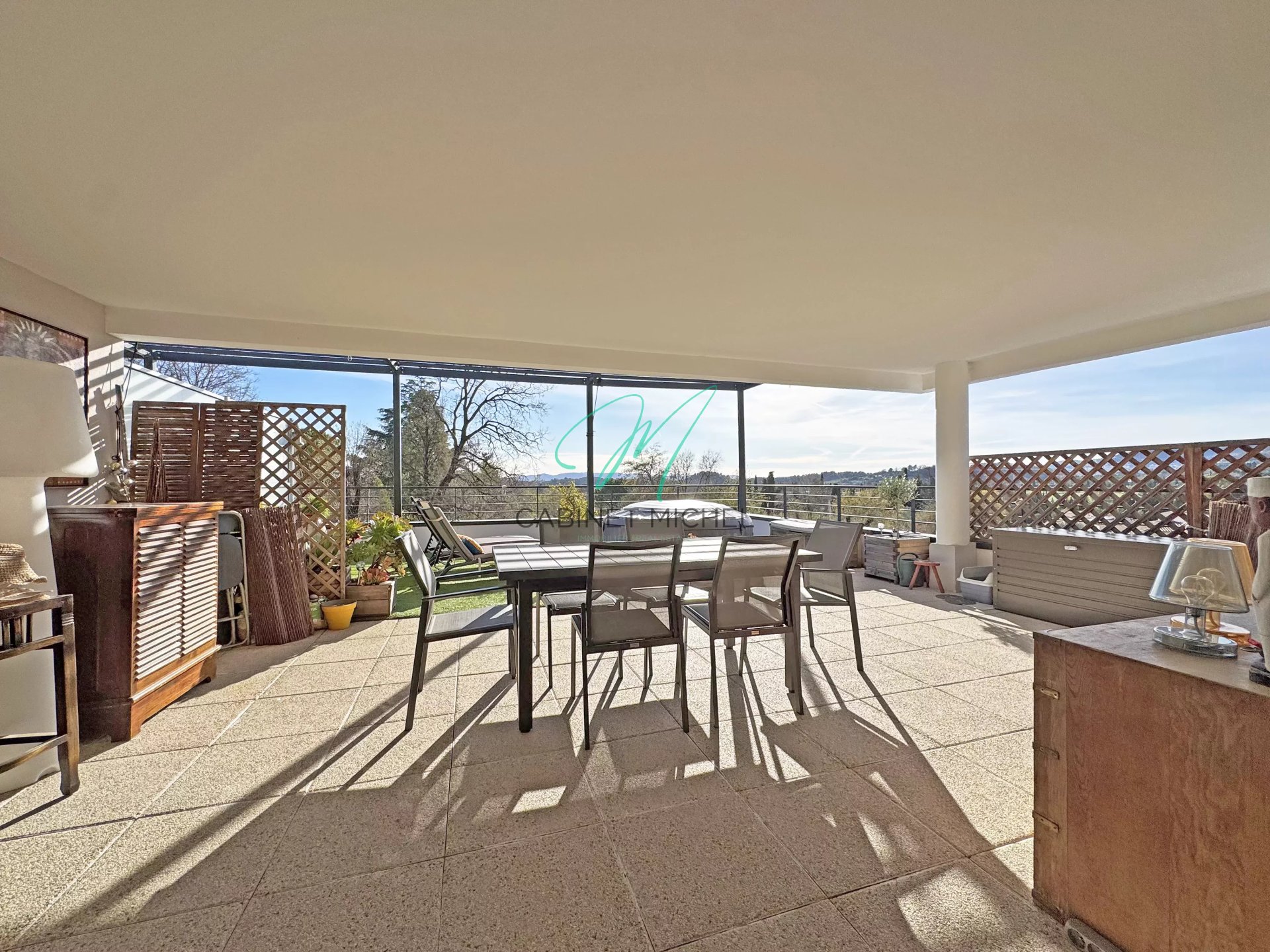 L’atout majeur de ce bien réside dans sa vaste terrasse de 60 m², dont une partie couverte, offrant une vue dégagée et une triple exposition idéale. La terrasse comprend une zone à dalle renforcée, offrant la possibilité d’y installer un jacuzzi pour profiter pleinement de cet extérieur d’exception. La résidence, fermée et parfaitement entretenue, assure tranquillité et confort au quotidien. Deux places de stationnement privatives viennent parfaire l’ensemble.