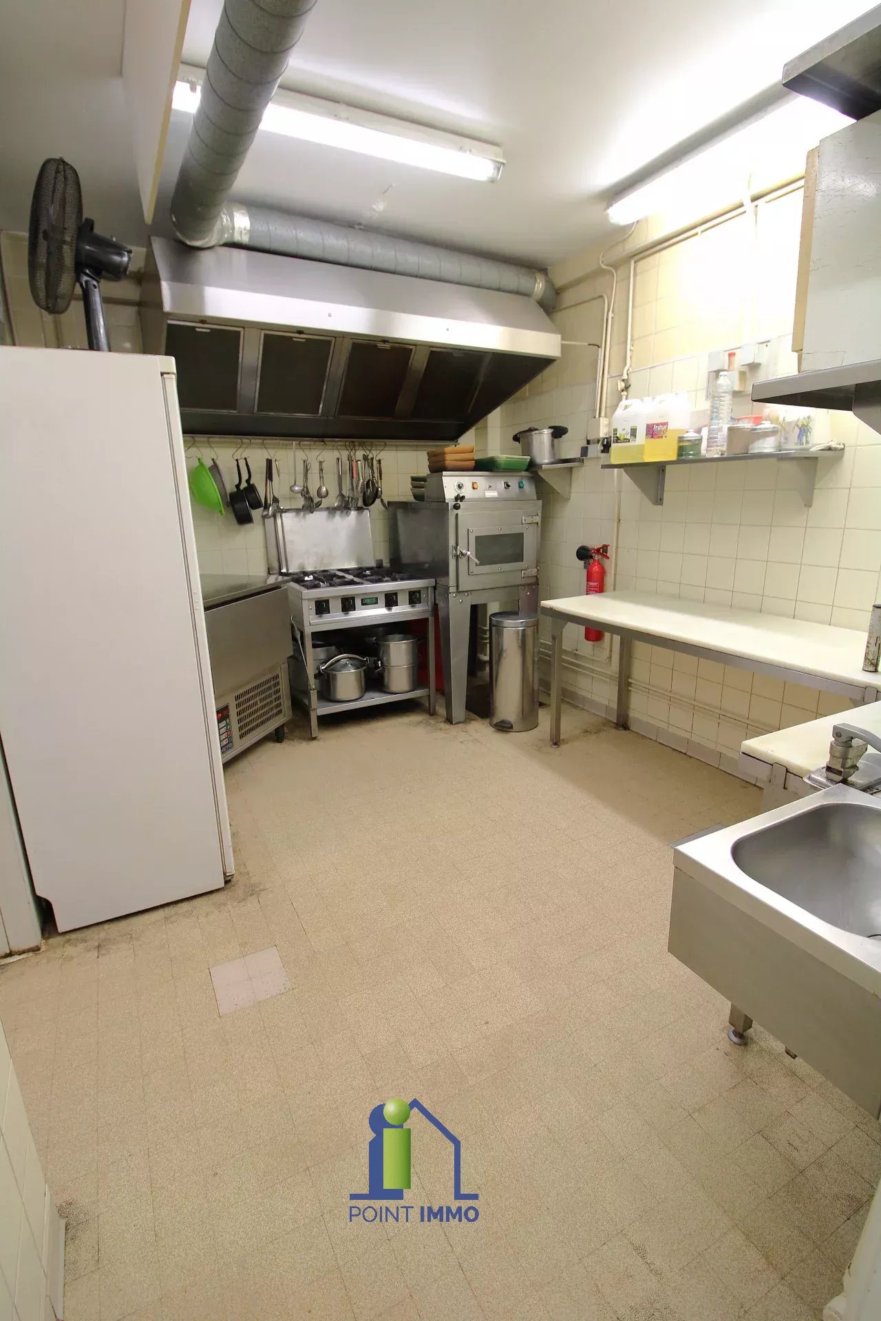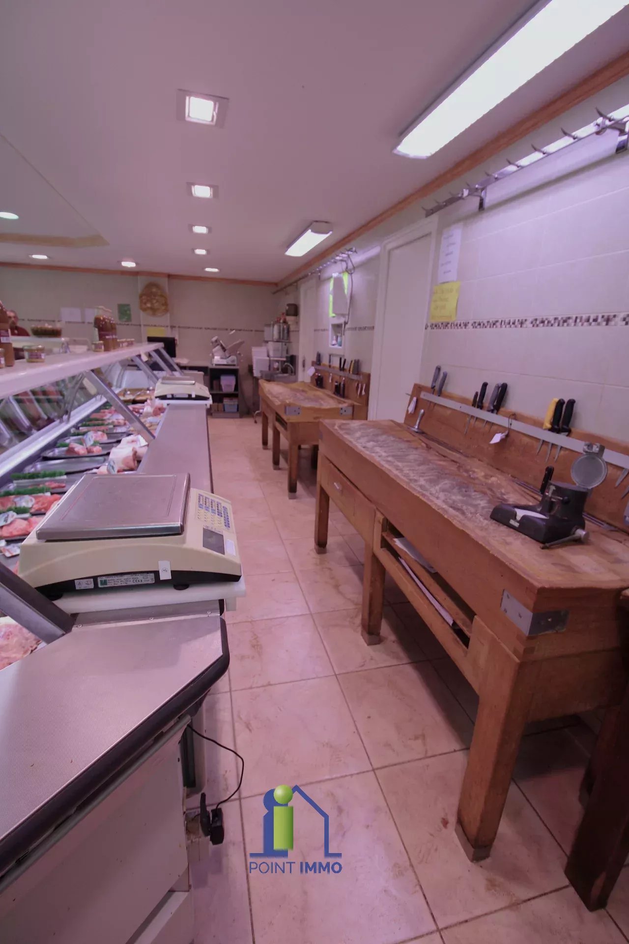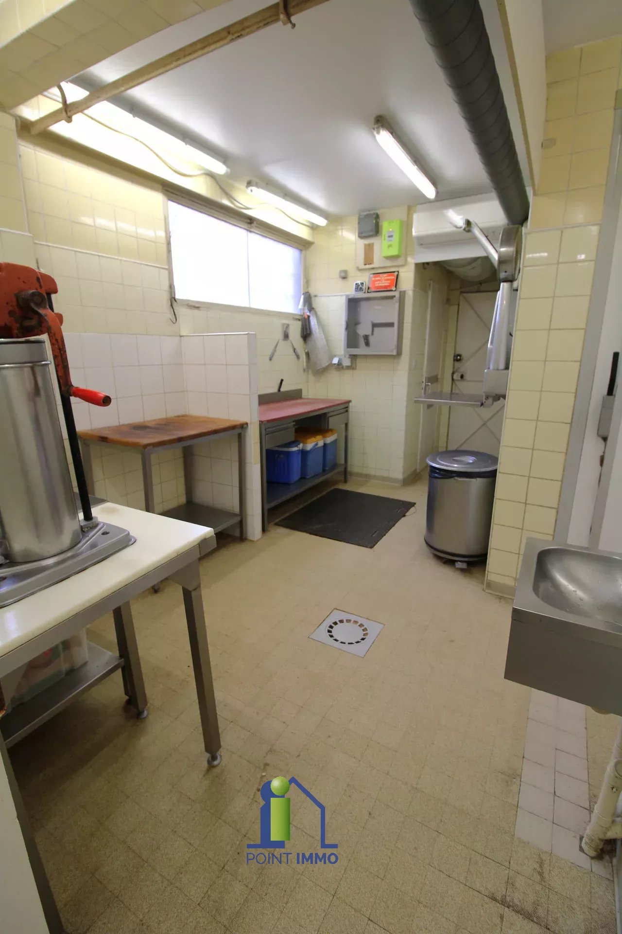 Avec ses trois belles vitrines, le local se décompose d'un espace de vente de 88 m², deux chambres froides de 3 m² et 6 m², de deux espaces de préparation de 27 m² en tout, d'un bureau et de WC.
