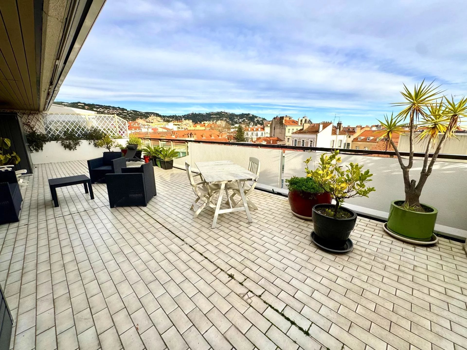 CANNES CENTRE EXCLUSIF, Villa toit avec 93m² de terrasses et véranda dans résidence de standing à proximité de tous commerces, cuisine équipée indépendante, 2 chambres, 2 salles d'eau, climatisation réversible et chauffage collectif, dressings, placards, 3 toilettes, cave et double garage.
