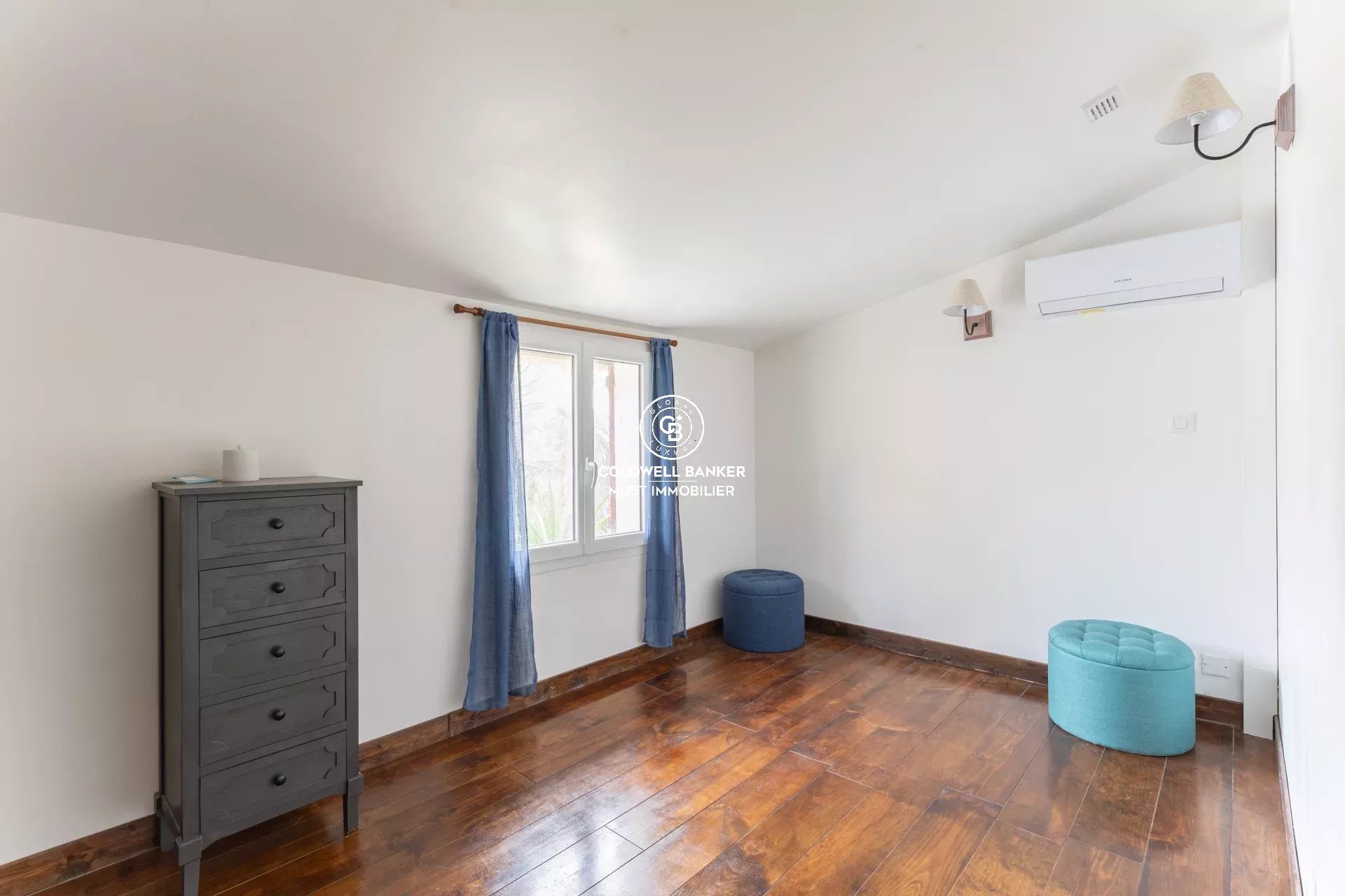 Dès l’entrée, vous découvrirez une vaste pièce de vie baignée de lumière, ouverte d’un côté sur un patio intimiste et de l’autre sur un agréable jardin. Celui-ci accueille une piscine hors sol et une terrasse surélevée, parfaites pour profiter des beaux jours en toute intimité, à l’abri des regards.