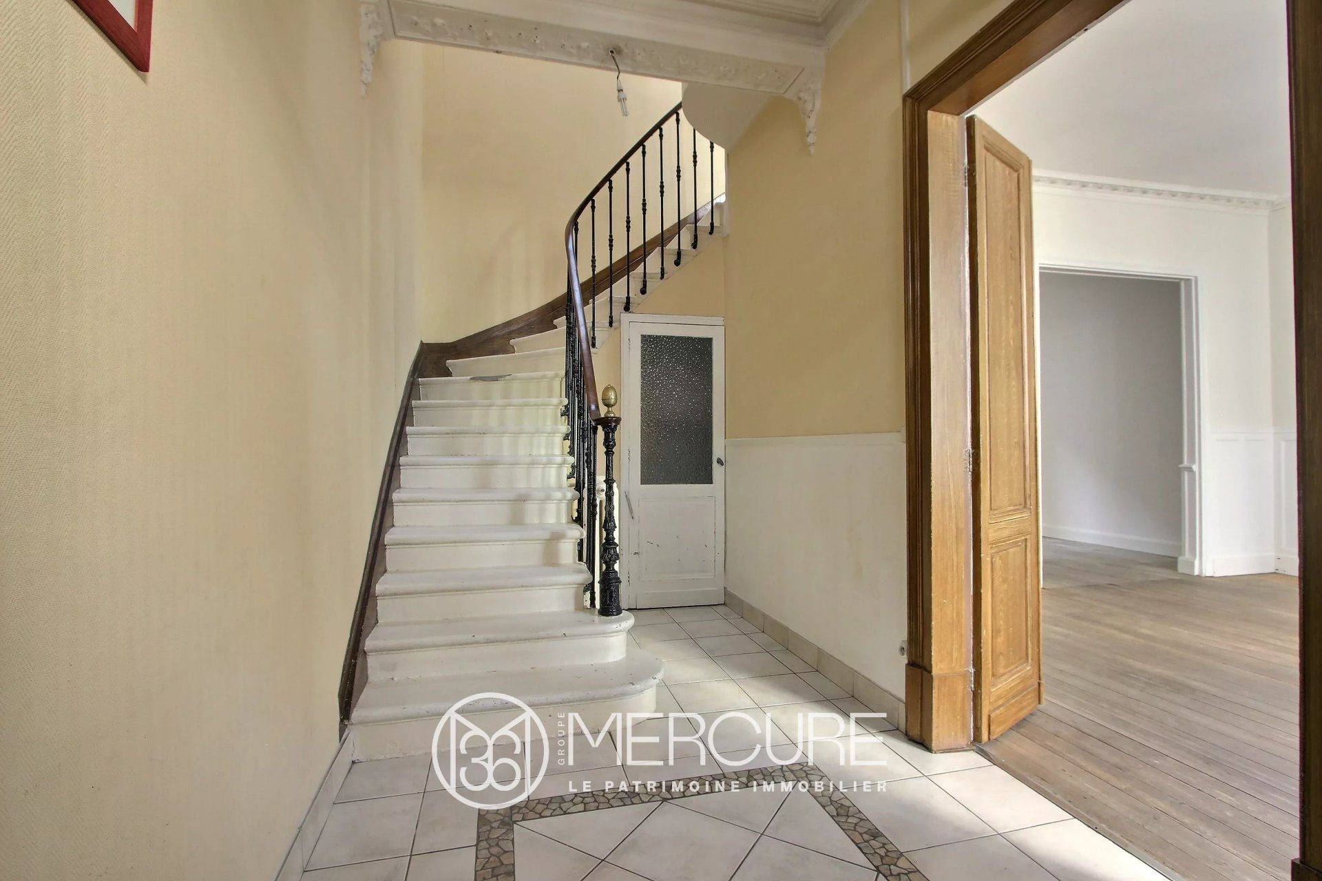 Eléments d’époque conservés : façade ouvragée, escalier en pierre, parquets, moulures et cheminées.
