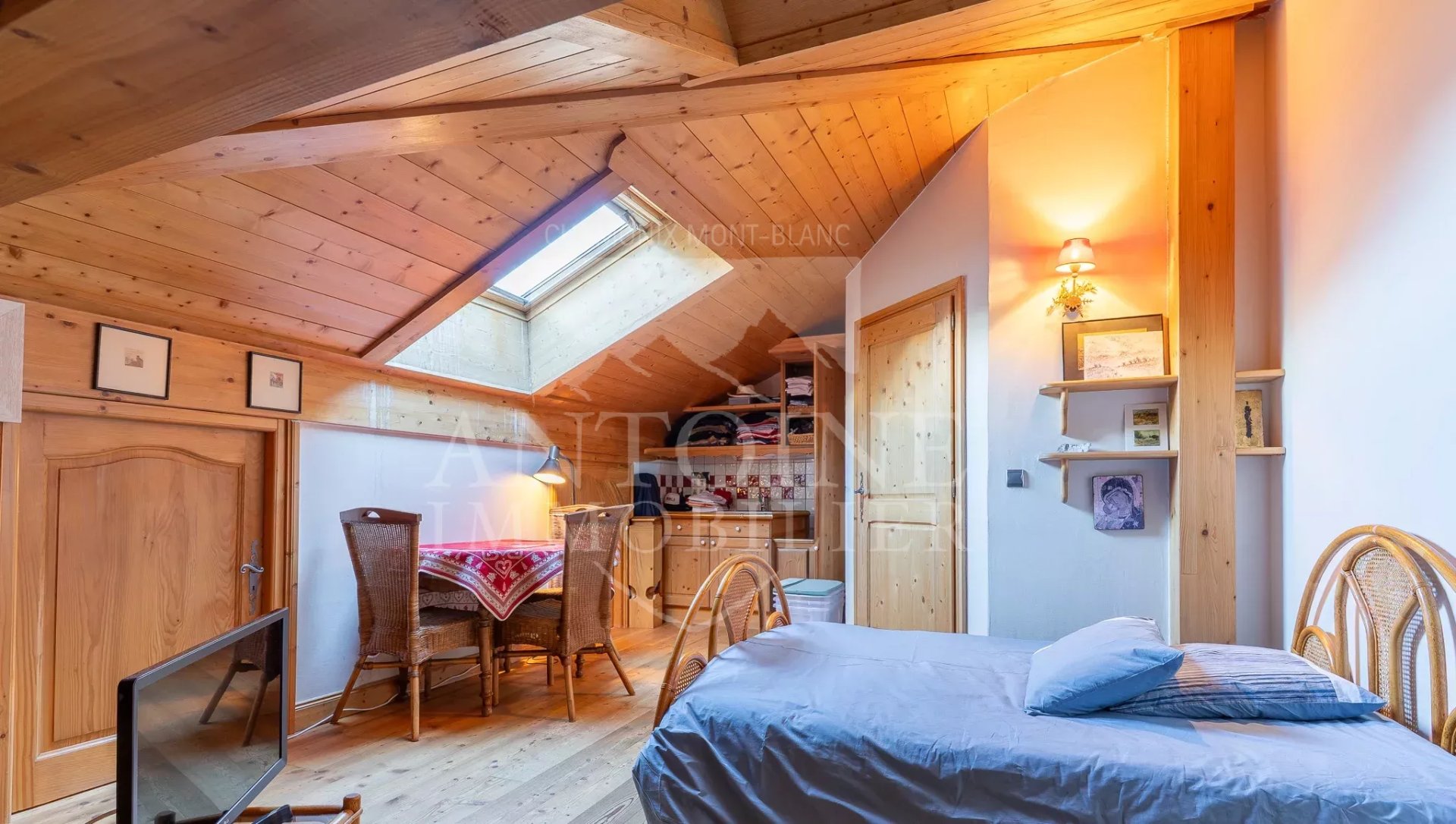 Deux balcons prolongent cet espace : l’un de 8 m2 offre une vue remarquable sur le massif du Mont-Blanc, l’autre de 4 m2 une perspective dégagée sur le Brévent.