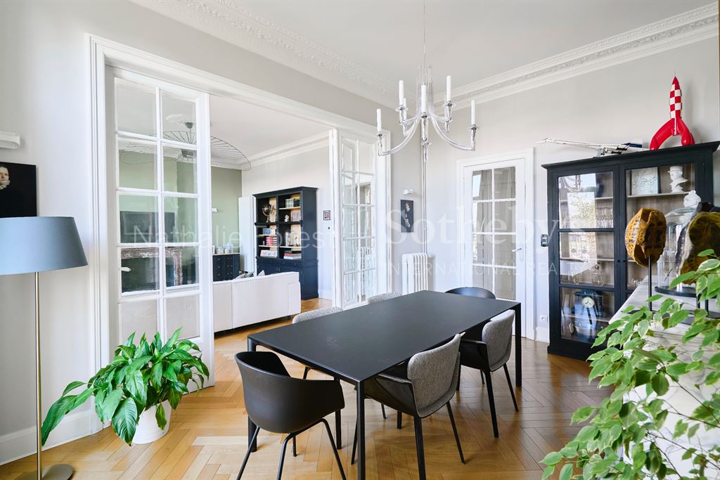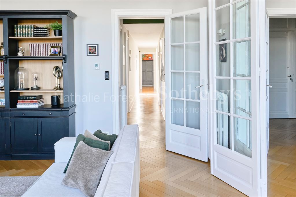 La large galerie d’entrée avec vestiaires donne le ton de cet appartement : entre chic de l’ancien et raffinement du contemporain.