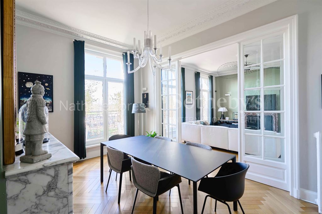 Celle-ci s’ouvre sur un exceptionnel double séjour aux plafonds anciens, cheminées préservées (cheminée à l’éthanol intégrée) et parquet en chevron disposant d’une vue imprenable sur la Deûle et ses péniches et composé d’une belle salle à manger et d’un living.