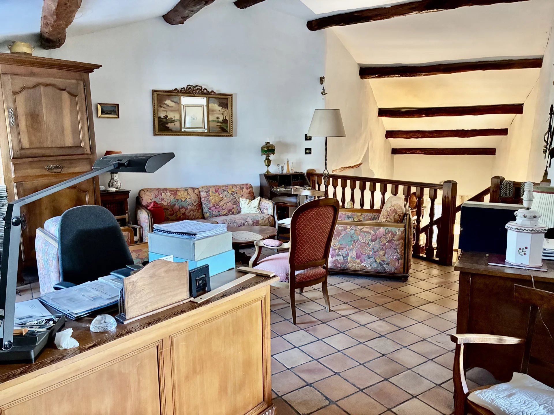 Au 1er étage, couloir de distribution donnant sur 2 chambres, salle de bain, toilette, cuisine indépendante, grand séjour cathédrale avec poutre apparente.