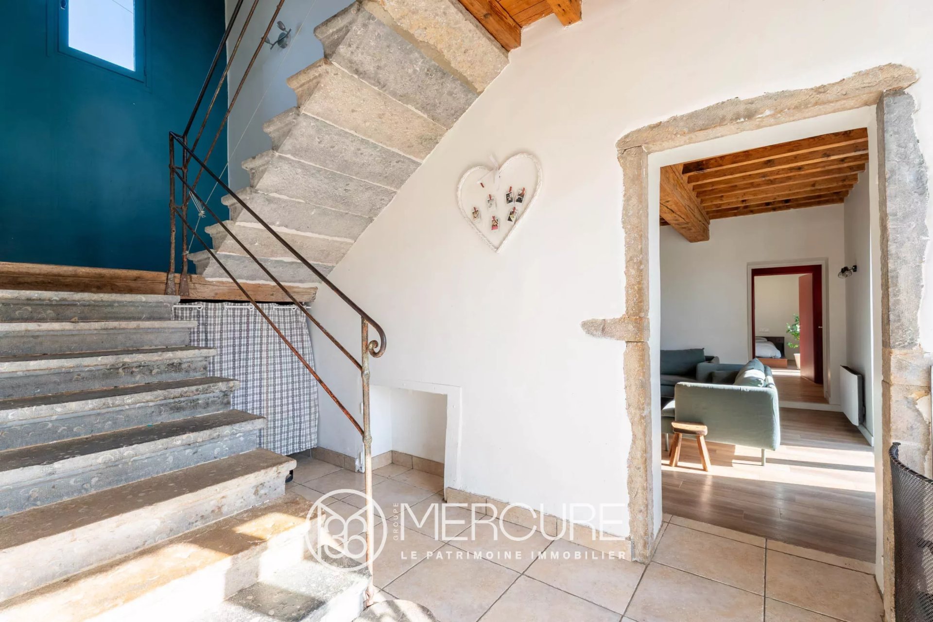 Le rez-de-chaussée, entièrement rénové avec des matériaux haut de gamme, met en valeur des plafonds à la française restaurés, une élégante cage d'escalier en pierre et bois, une cheminée en pierre dans le séjour plein sud, une cuisine / salle-à-manger avec cellier terrasse et four à pain, ainsi qu'une suite parentale de plain-pied.