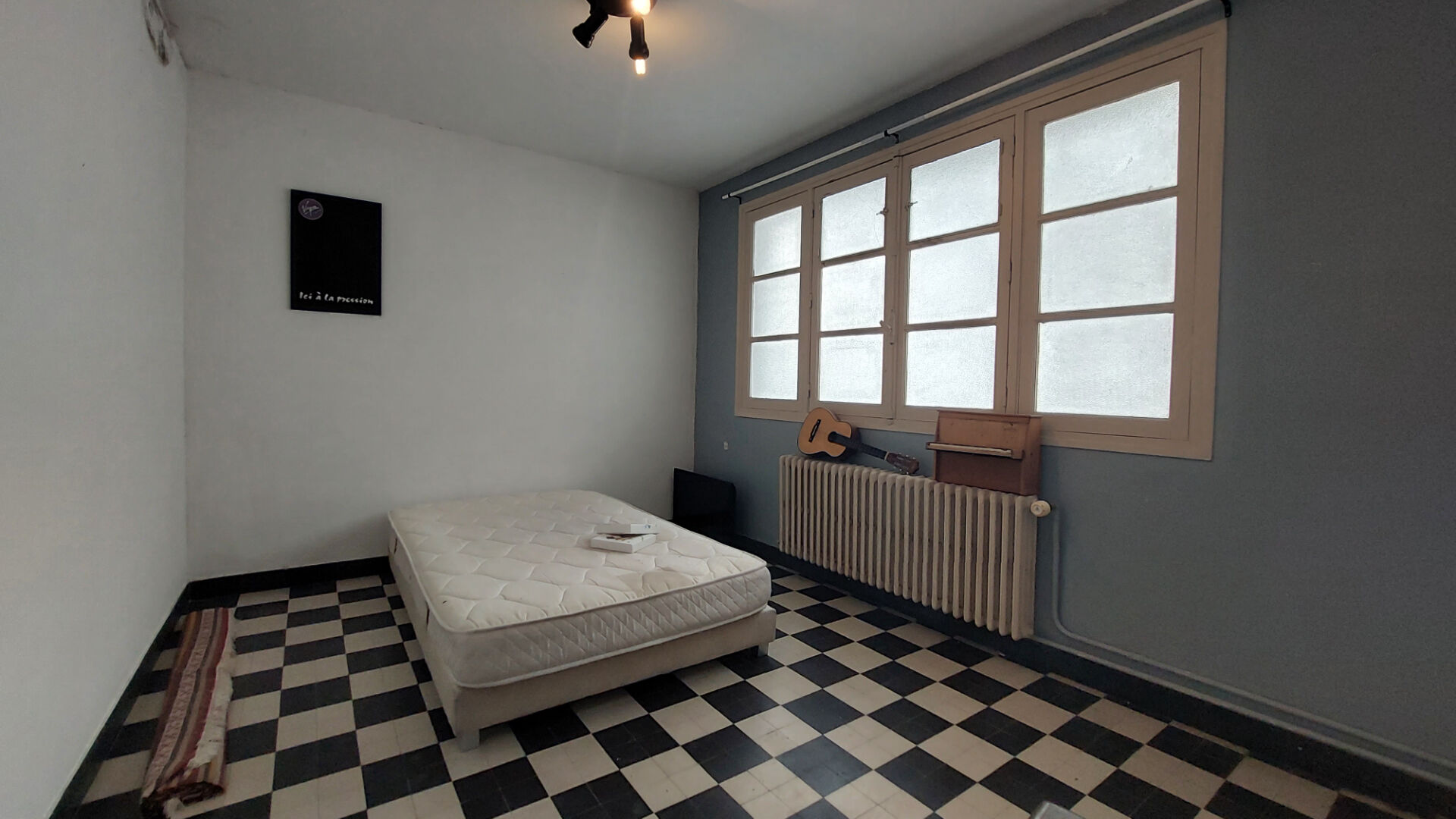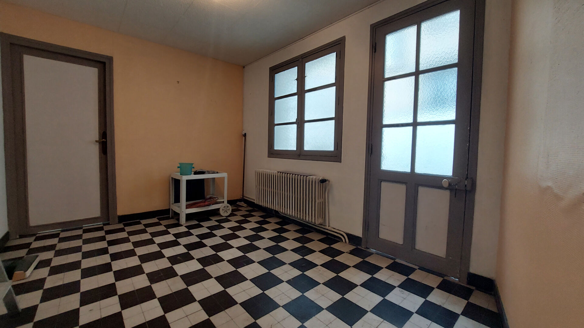 Au rez-de-chaussée, un F2 avec une chambre, une pièce de vie, cuisine aménagée et équipée, salle de bains, WC, ainsi qu'un couloir menant vers deux pièces à repenser, dont l'une donne accès à un jardin privatif de 152 m².