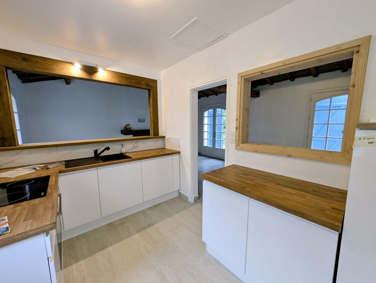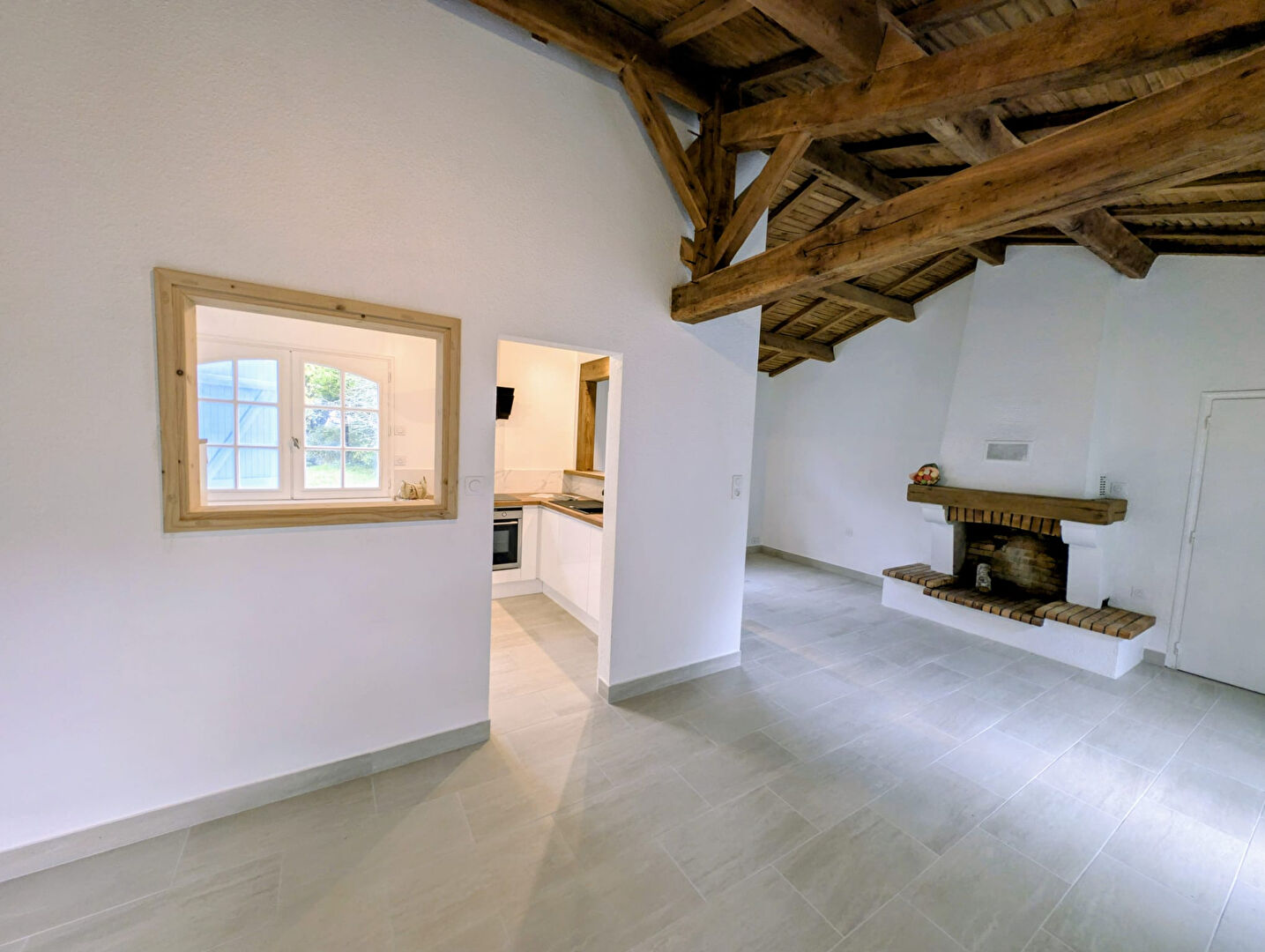 On peut également souligner l'agréable séjour et sa belle cheminée avec poutre apparentes ouvert sur sa cuisine équipée.