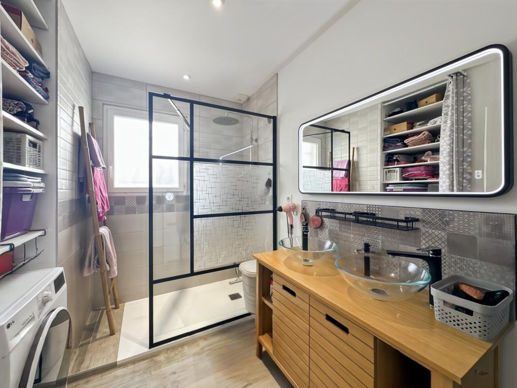 L'entrée s'ouvre sur une spacieuse pièce de vie de 46 m² comprenant la cuisine et le salon, offrant une belle luminosité grâce à son exposition sud-est. Cet espace de vie donne accès à une terrasse agrémentée d'une pergola. La partie nuit se compose de deux chambres de 11m² équipées de placards, d'une chambre parentale de 14m² disposant d'un dressing et de sa propre salle d'eau, ainsi que d'une seconde salle d'eau indépendante et d'un WC séparé. Un garage de 21 m² vient compléter l'ensemble.
