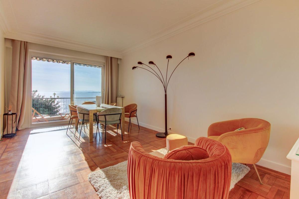 Le séjour de 21 m², lumineux grâce à son exposition plein sud et à ses ouvertures, donne accès à une terrasse de 11 m² avec vue directe sur la Baie des Anges. Cet espace extérieur constitue un véritable prolongement de la pièce de vie, idéal pour profiter des beaux jours.