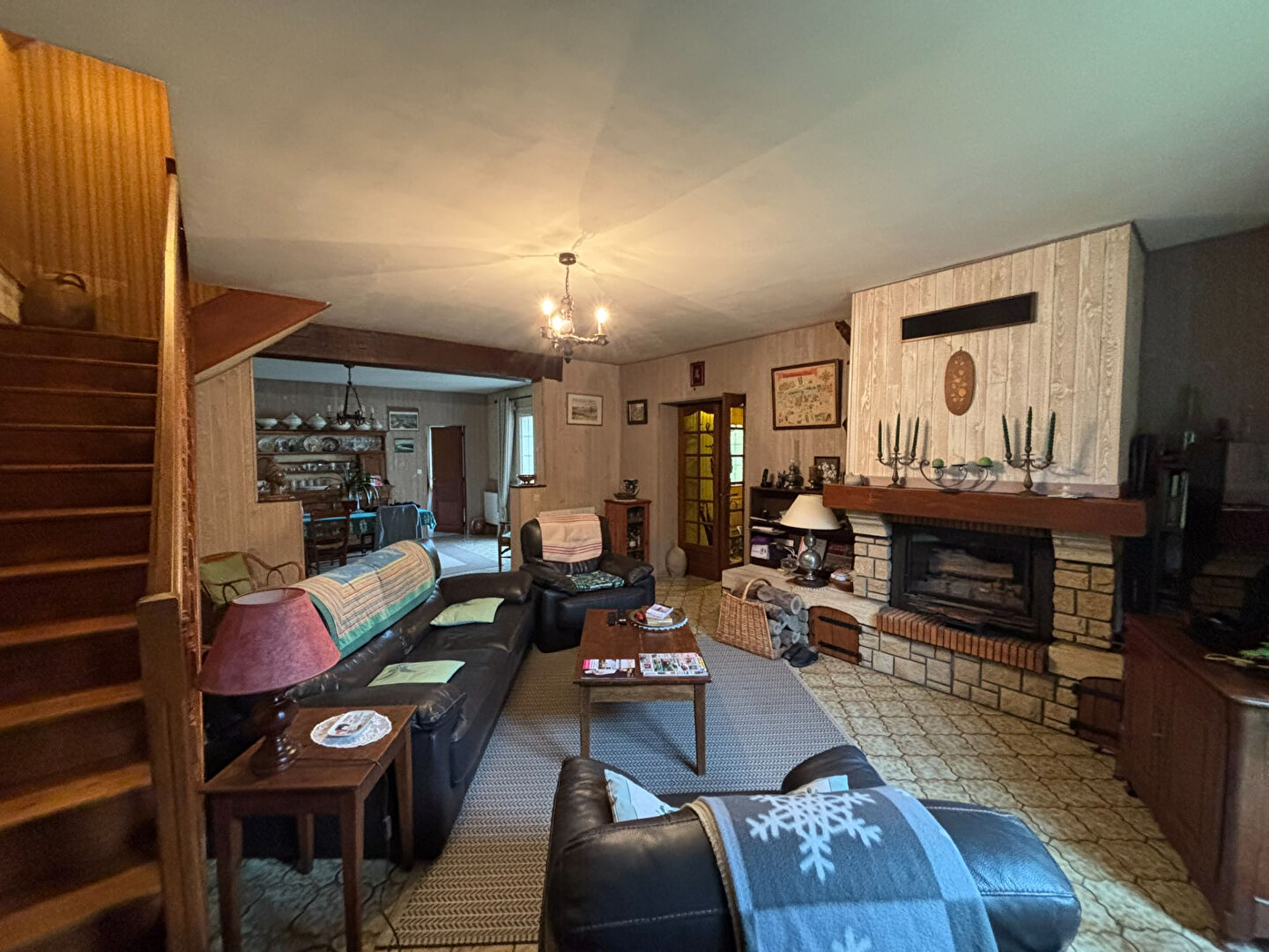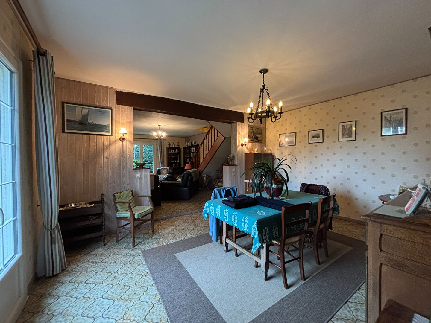 La maison à rafraichir se compose au rez-de-chaussée : d'une entrée, une salle d'eau avec baignoire, un WC, une cuisine salle à manger, un salon avec insert à bois, une salle à manger et une grande chambre.