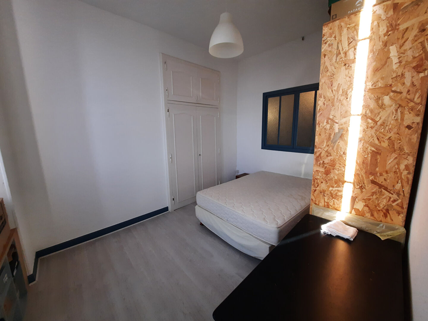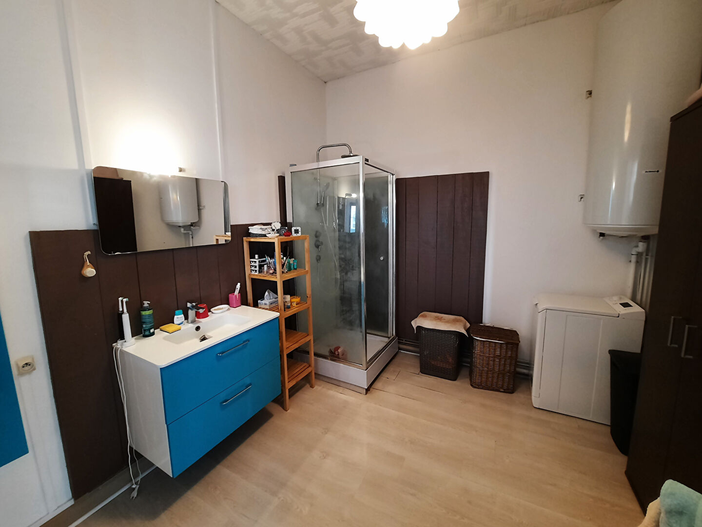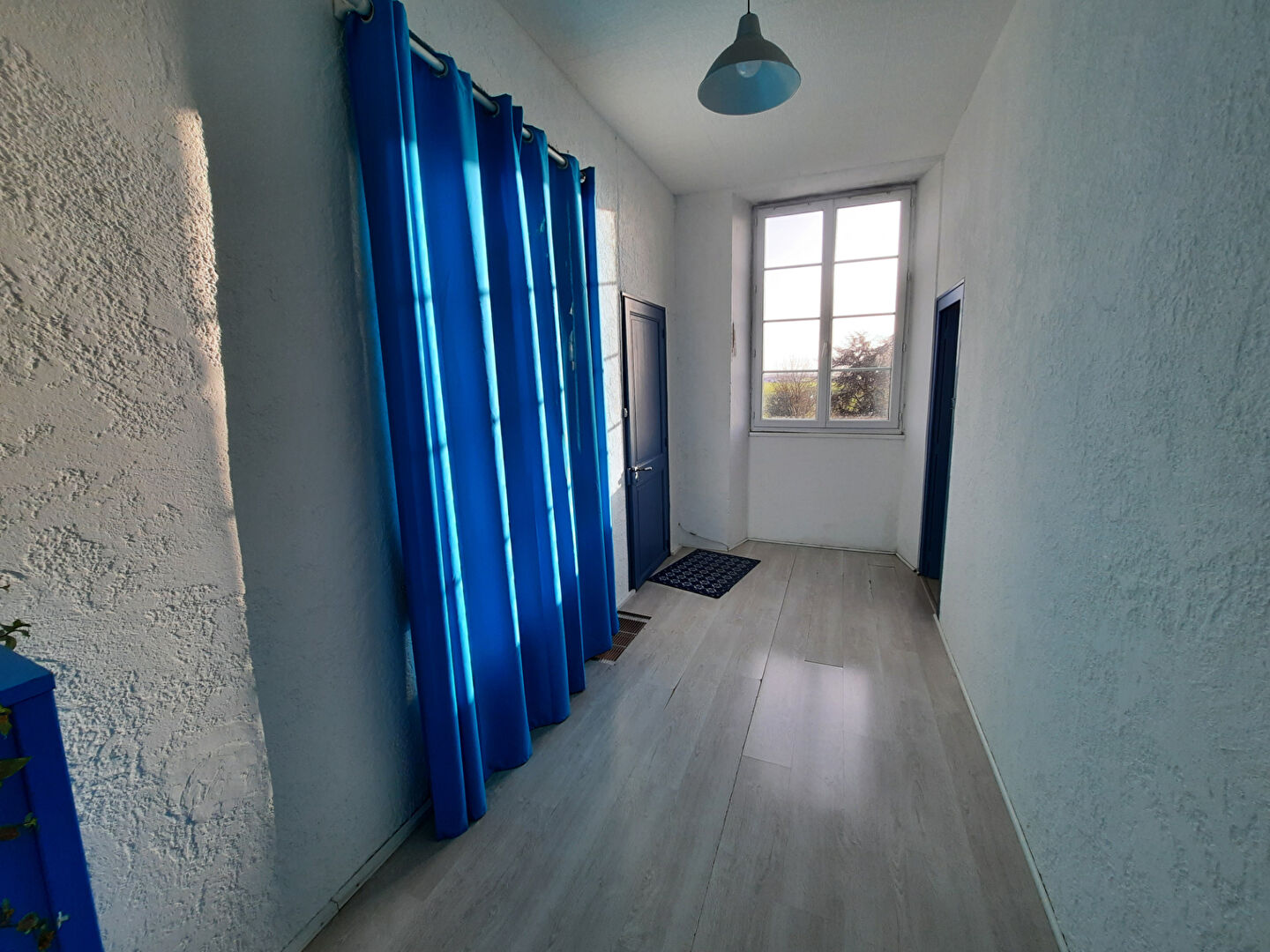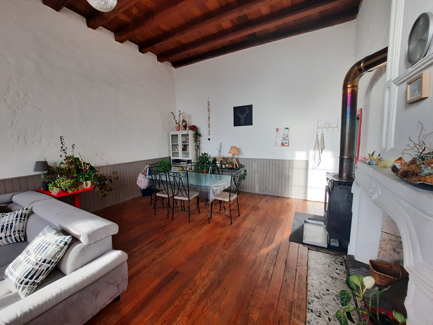 D'une surface habitable de plus de 100m2, elle offre, au rez-de-chaussée, une entrée avec rangements, un wc indépendant, une pièce de vie lumineuse de plus de 4m de hauteur avec un poêle à bois et une cuisine indépendante.