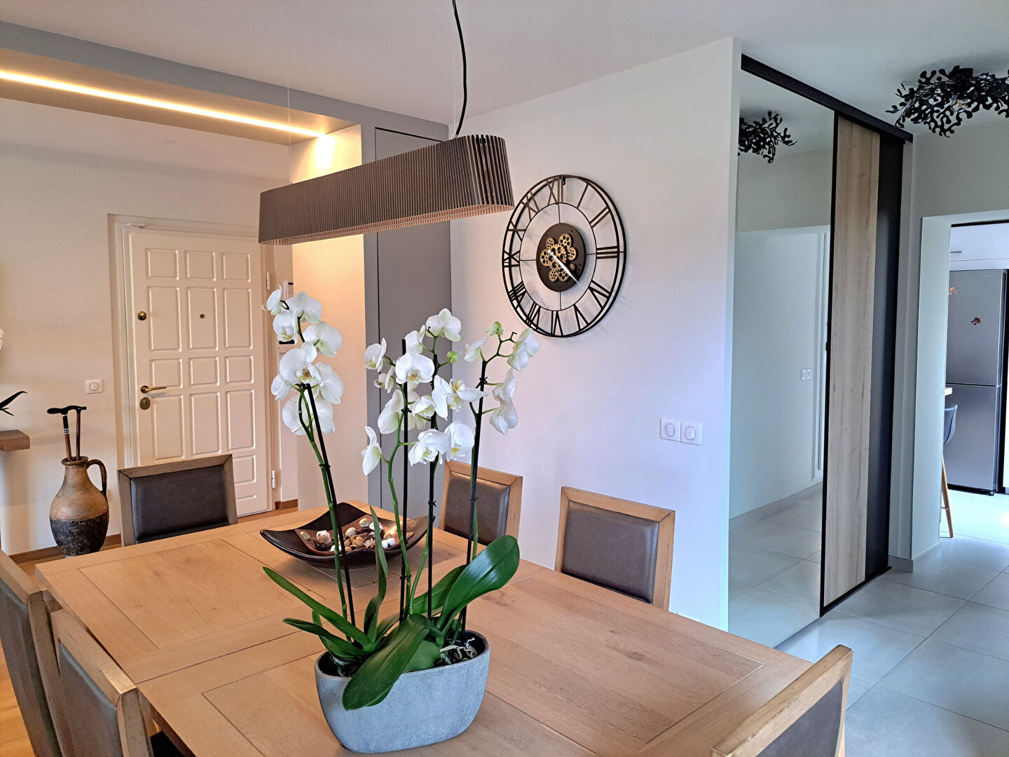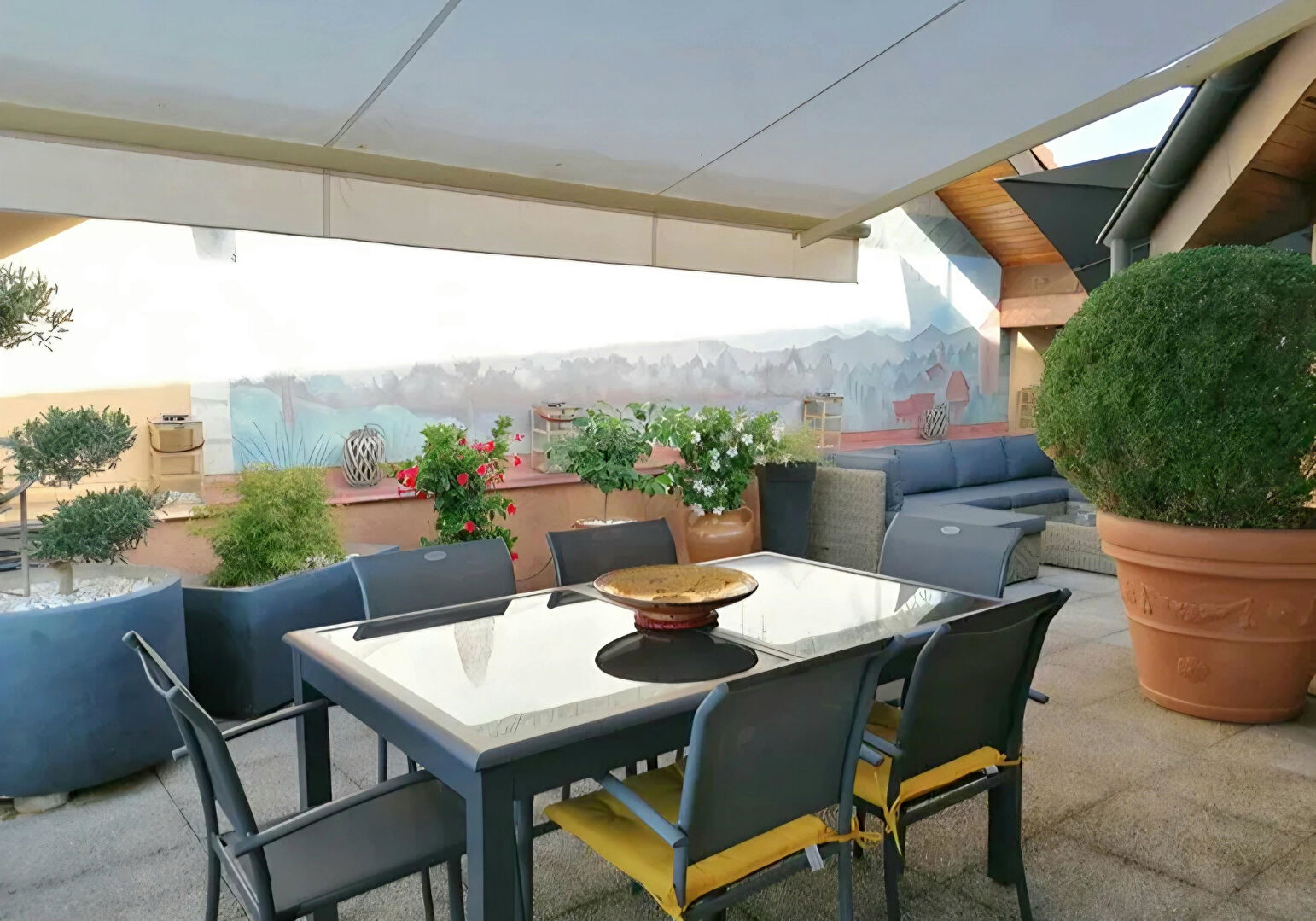 Dès l'entrée, l'atmosphère séduit par sa luminosité et la qualité de ses finitions. Les volumes généreux et les lignes épurées confèrent au séjour une élégance naturelle, sublimée par de larges ouvertures sur l'extérieur. La pièce de réception s'étend vers une terrasse de 50 m² exposée sud-ouest, véritable écrin à ciel ouvert offrant une vue imprenable sur les reliefs du Jura et, au loin, sur le célèbre Jet d'Eau. Un balcon attenant au salon vient compléter ces espaces extérieurs et invite à des moments de détente plus intimistes.