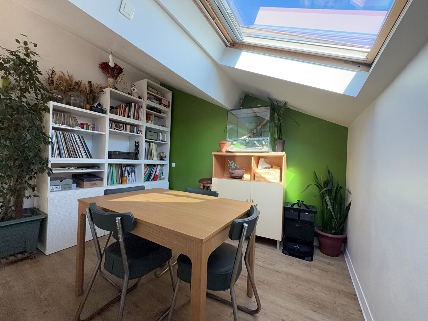 À l'étage, vous découvrirez une cuisine dinatoire, une chambre, un bureau, un salon ainsi qu'une salle d'eau avec WC.