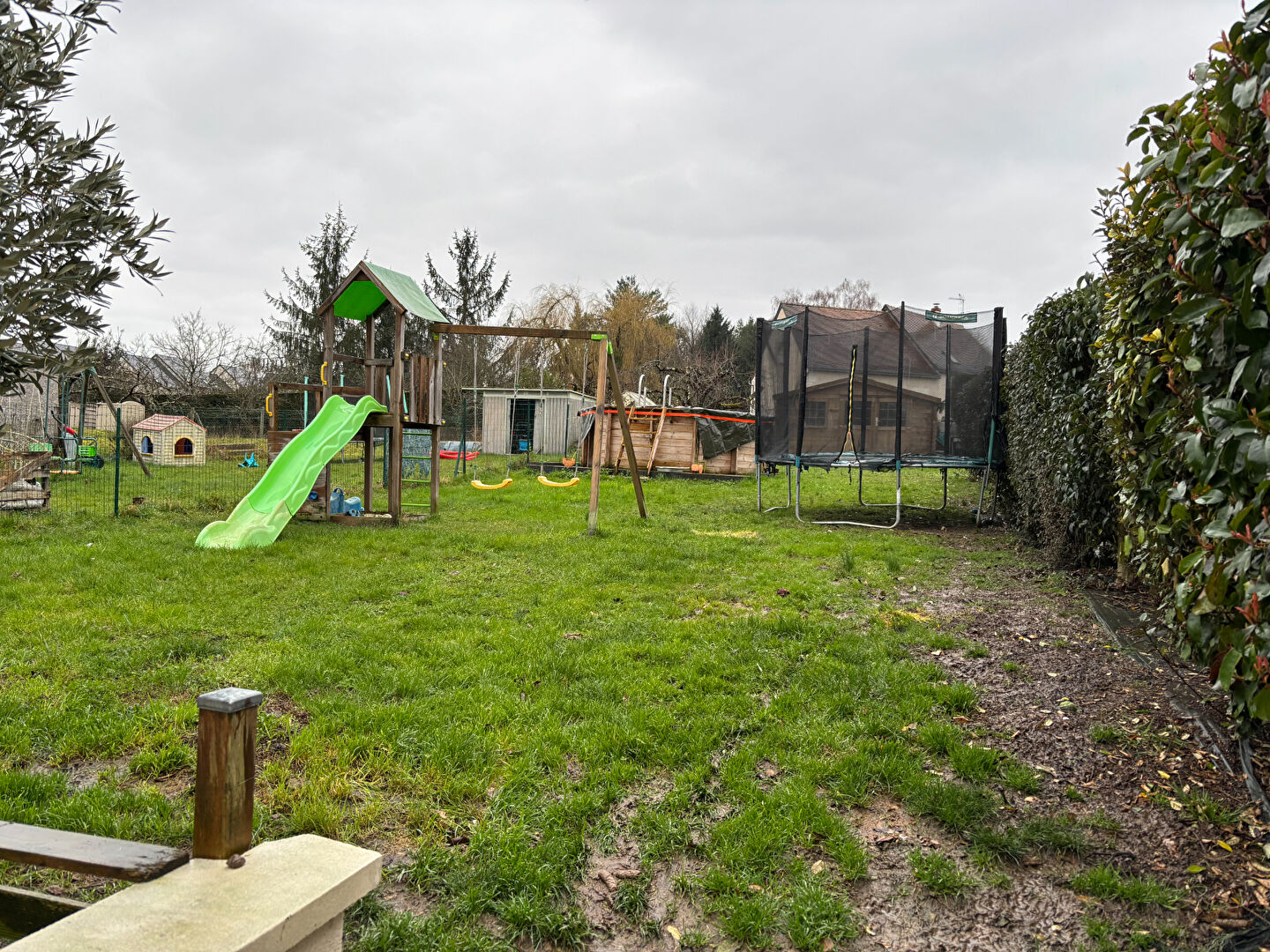 Un jardin entièrement clos, une entrée pour stationner un véhicule, une terrasse en L, une piscine semi-enterrée en bois et un cabanon de jardin.