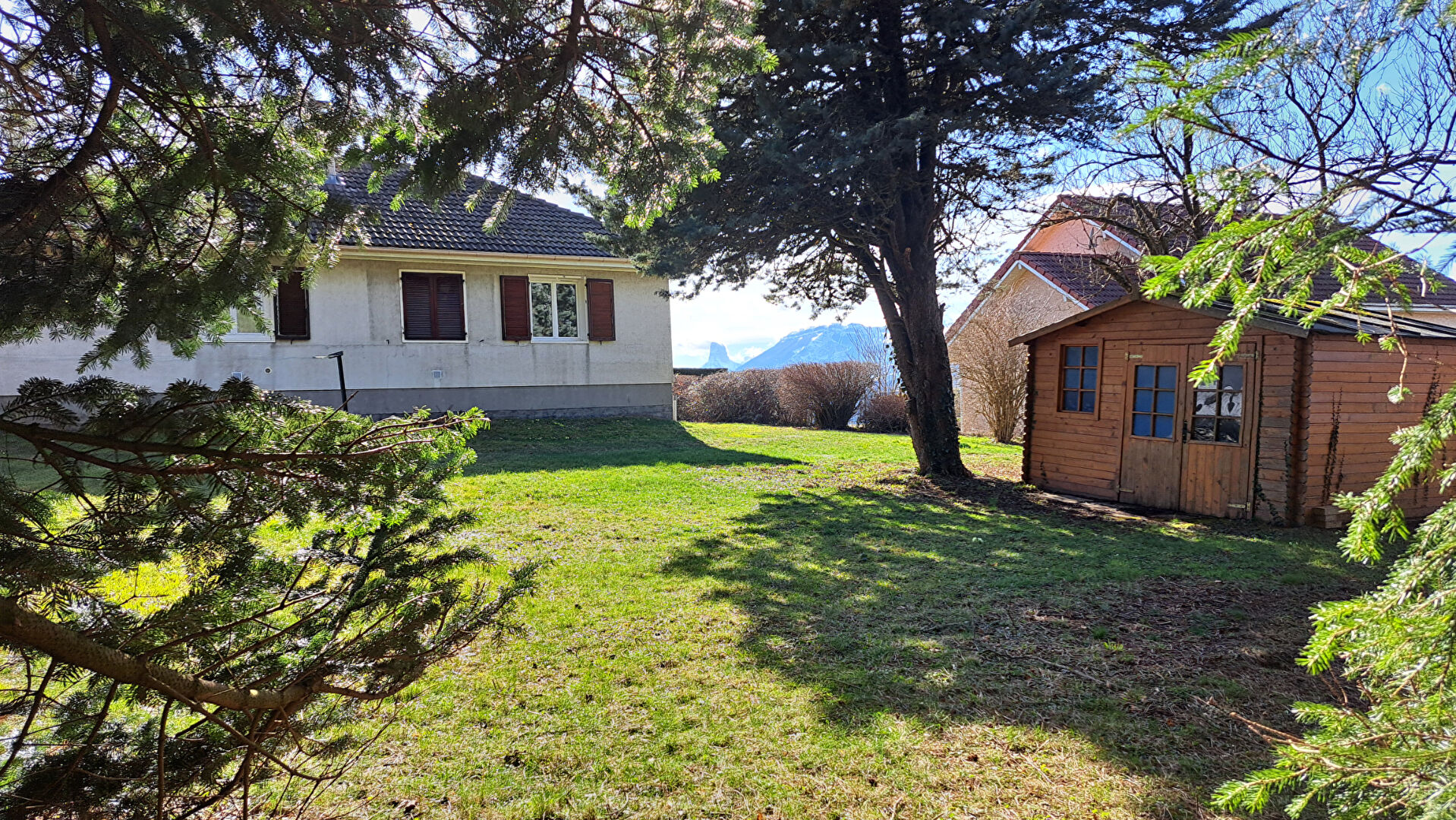 À l'extérieur, le grand terrain arboré est un véritable atout : espace de détente, jardin, potager. Un cabanon complète l'ensemble pour le stockage ou les projets de bricolage.