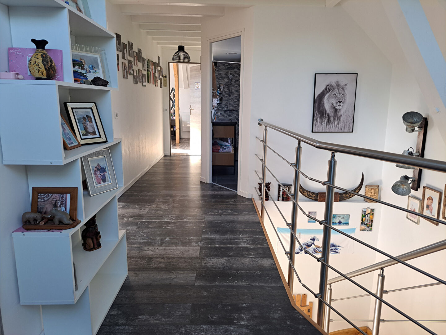 A l'étage, dégagement avec placard, chambre parentale avec dressing et coin bureau, deux chambres avec placard et salle de douche avec WC.