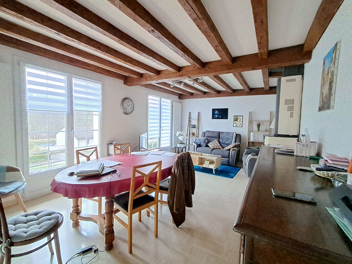 Au Rez-de-Chaussée : L'entrée dessert un bel espace de vie lumineux comprenant un salon/séjour chaleureux équipé d'un poêle à bois et une cuisine aménagée.