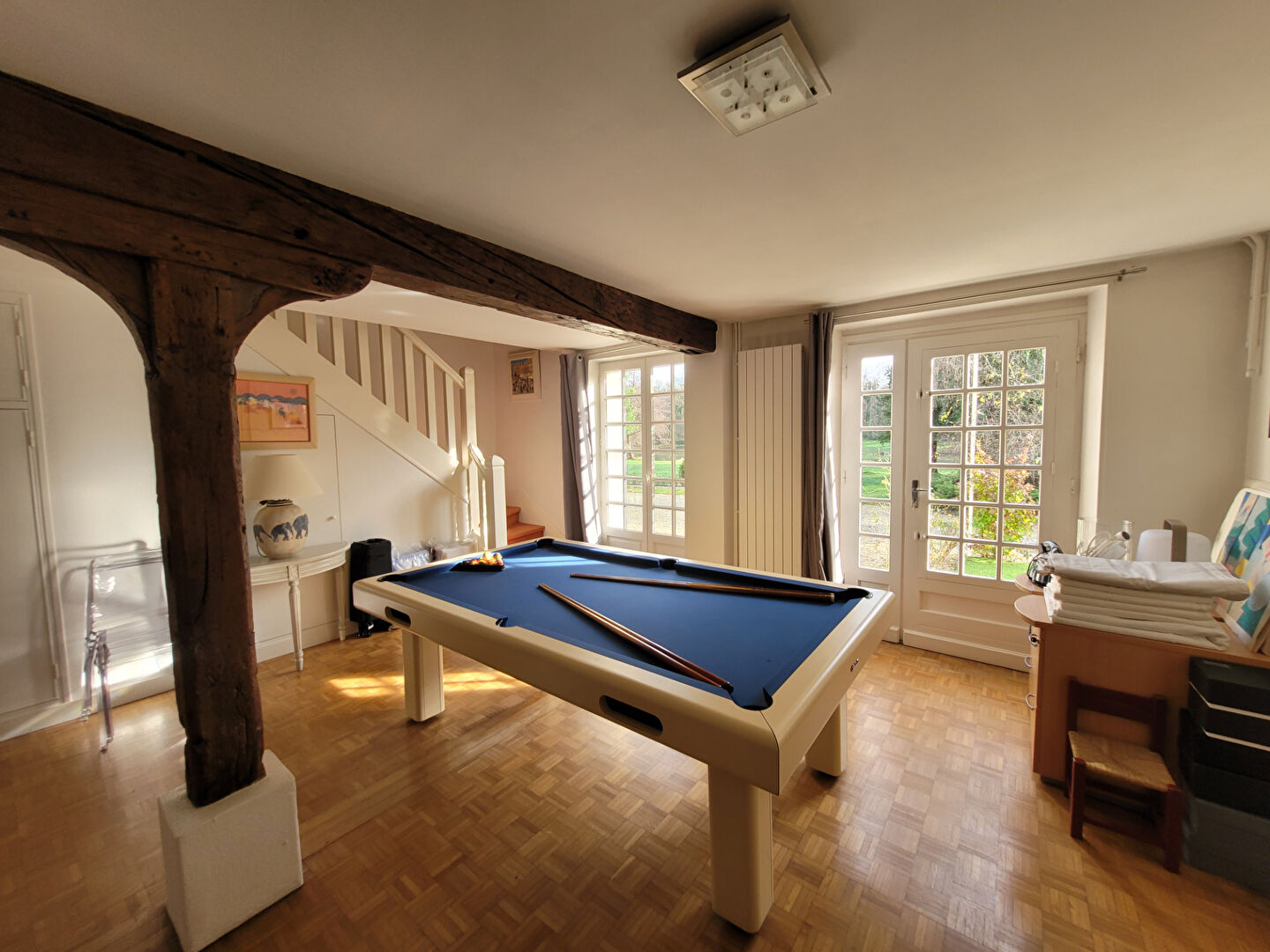 Au rez-de-chaussée, une entrée distribue une cuisine indépendante et une vaste pièce de réception d'environ 70 m² avec cheminée, bénéficiant d'une double exposition et d'un accès direct vers l'extérieur. Une aile dédiée à l'espace nuit comprend deux chambres disposant chacune de leur salle d'eau, ainsi qu'une pièce dédiée aux loisirs, idéale en salle de jeux ou de billard.