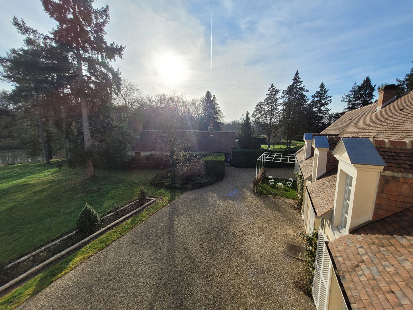 Les abords de la maison ont fait l'objet d'un aménagement soigné : parc arboré aux perspectives dégagées, allées structurées, élégante charmille, espace piscine avec pool house et court de tennis privé. L'ensemble invite à la détente et à la convivialité dans un cadre intimiste.