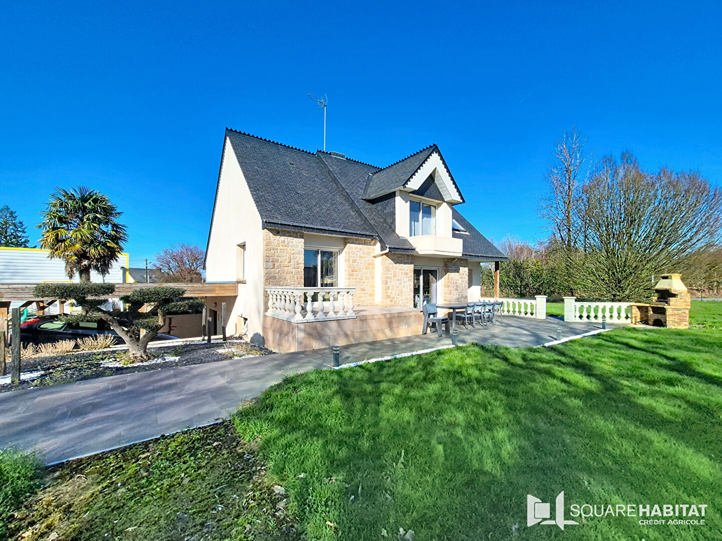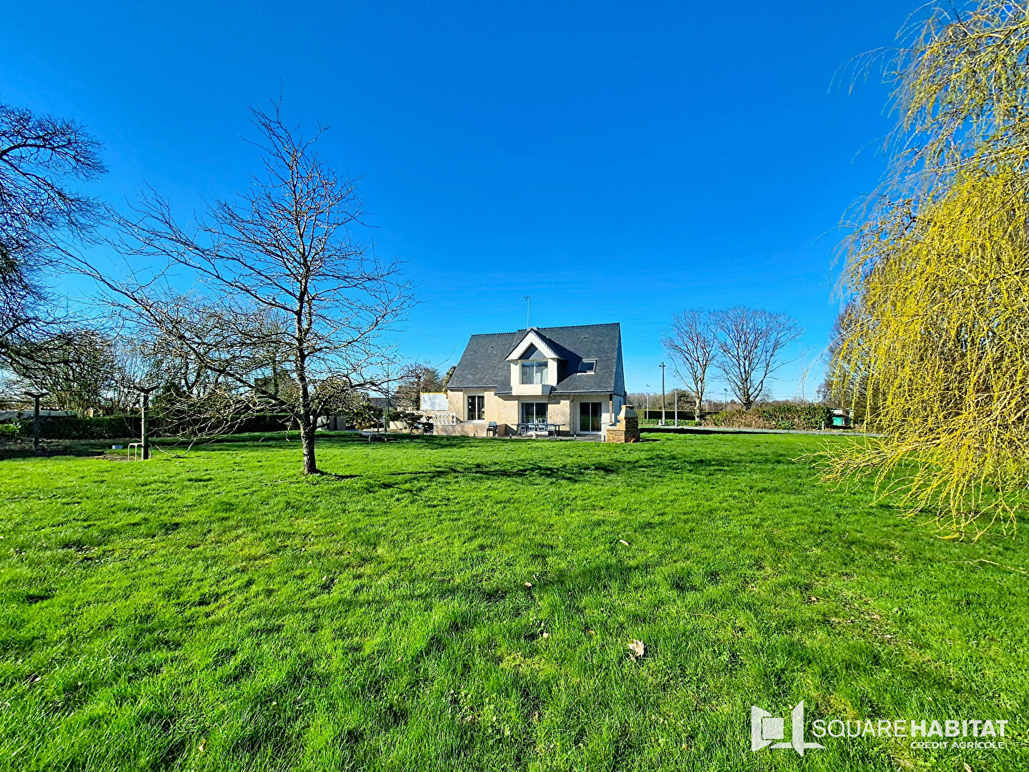 Terrasse exposée plein sud et terrain paysagé et arboré d'environ 3000 m², idéal pour profiter du calme et de la nature.