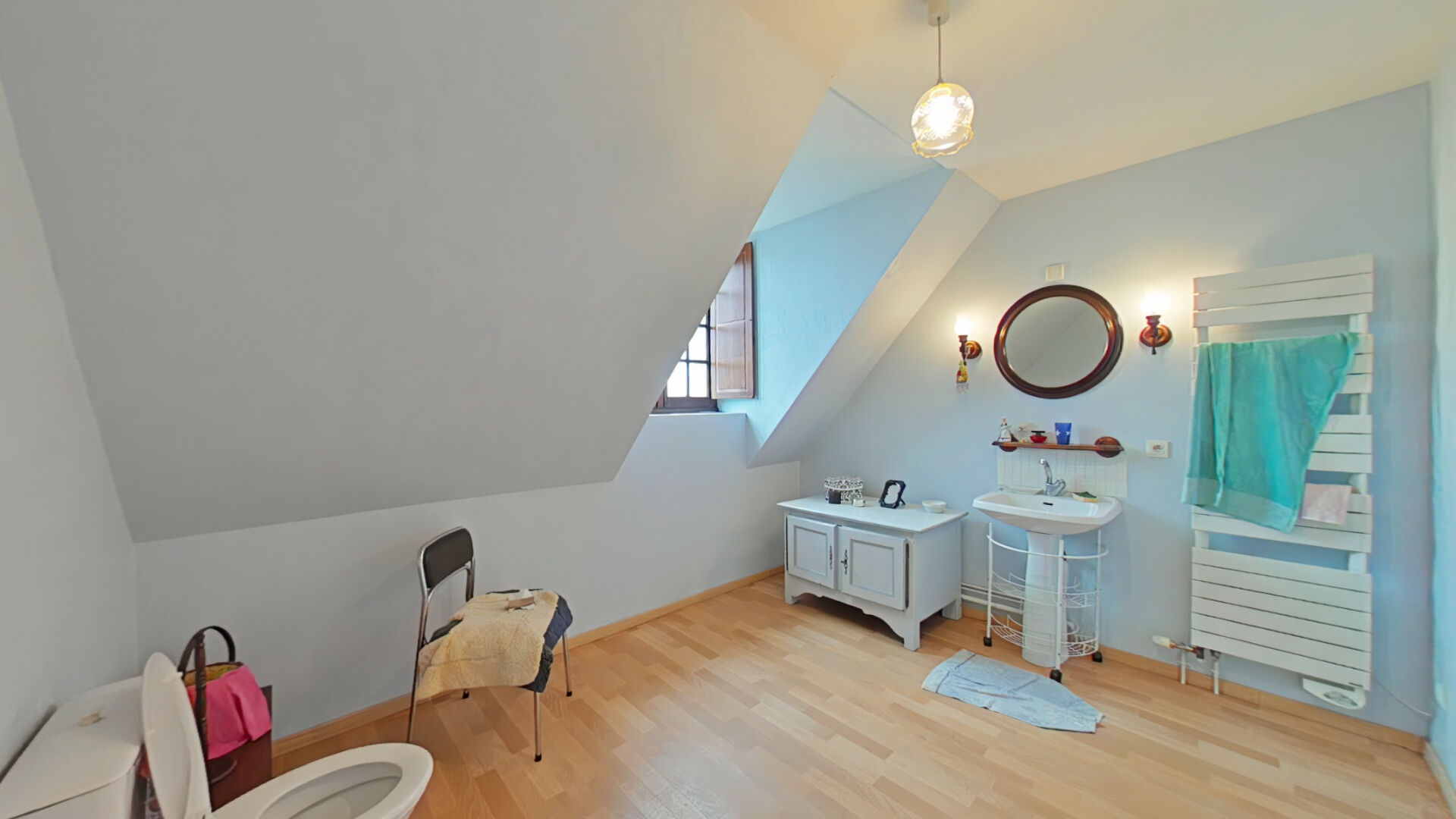 A l'étage, le palier donne accès à une lumineuse mezzanine, deux chambres, une salle d'eau avec WC et un grenier aménageable déjà isolé d'environ 20m².