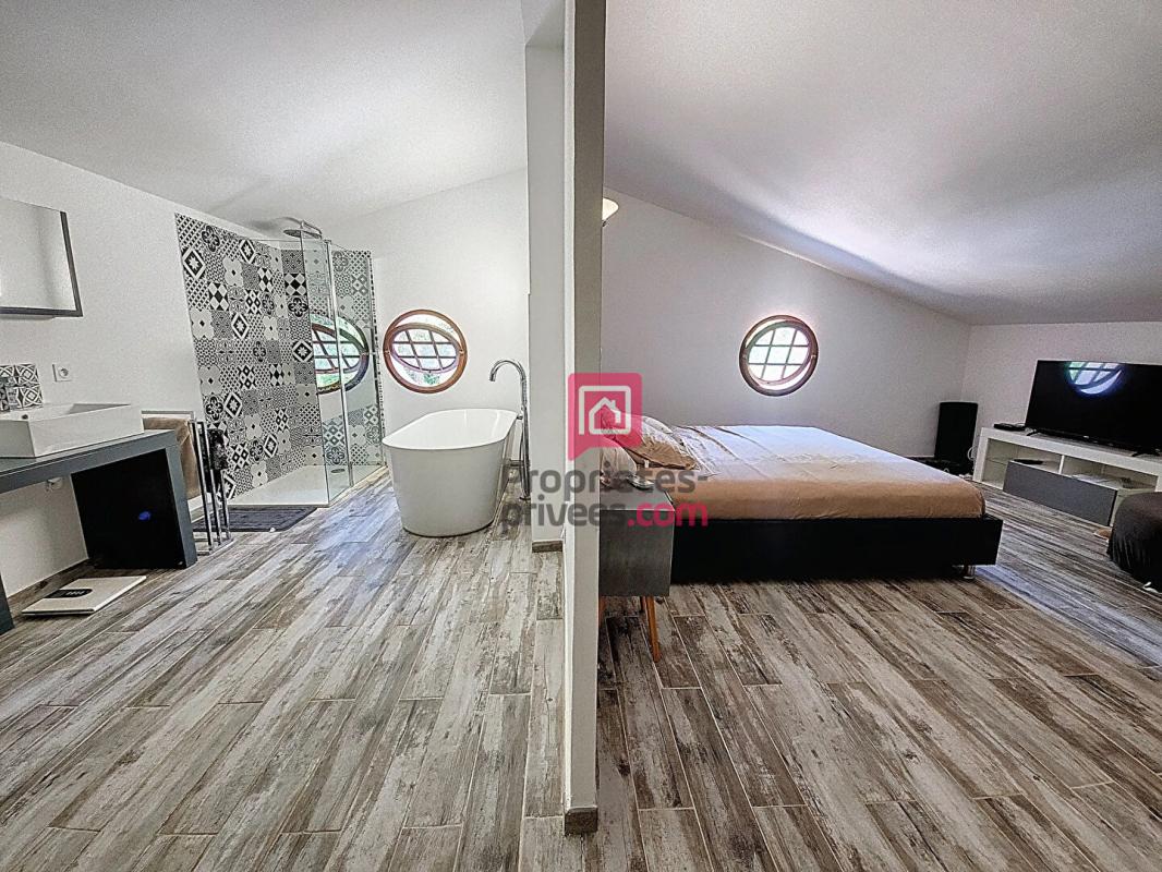 A l'étage, une suite parentale de 35m2 avec salle de bains privative, deux autres chambres, une salle d'eau et un dressing (ou 5e chambre) complètent l'espace nuit.