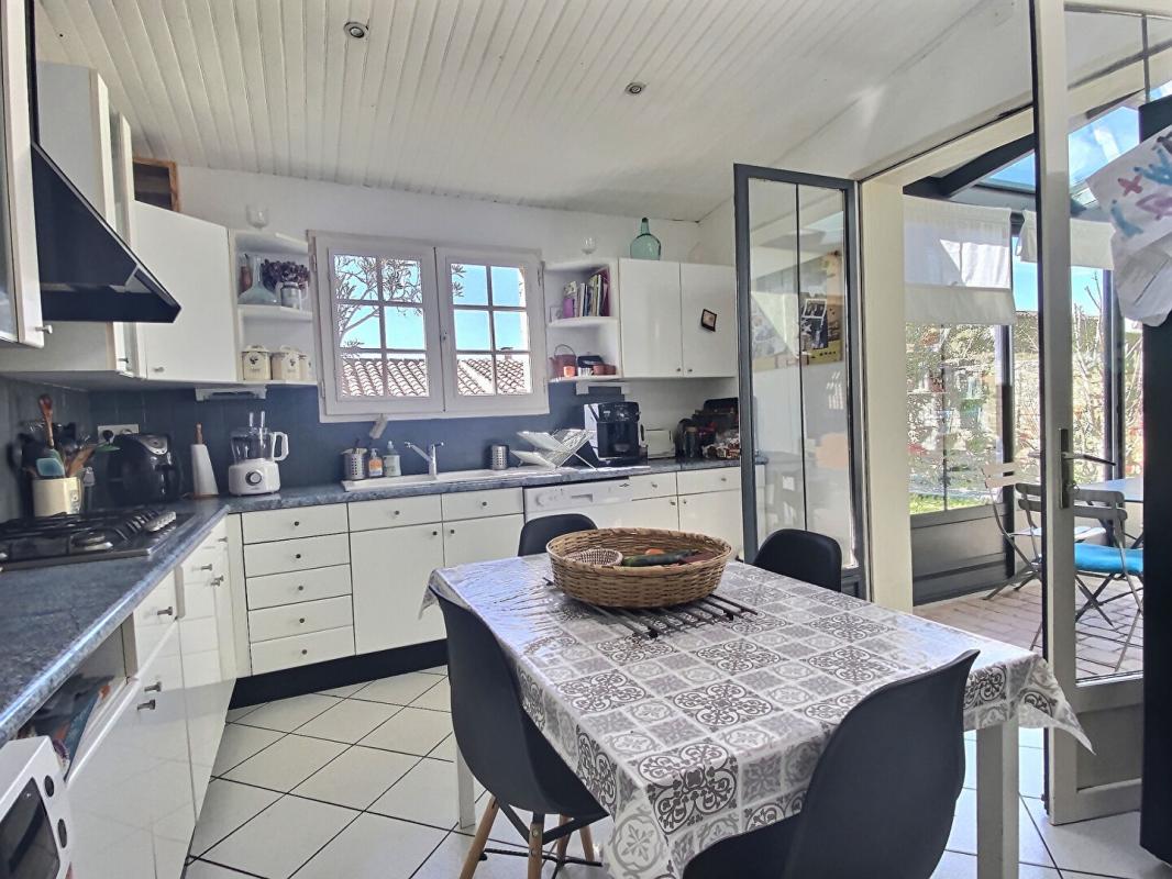 le hall d'entrée, un toilette, un espace bureau, une salle à manger ouverte sur la cuisine aménagée et équipée vue sur le jardin plus un accès dans la véranda.