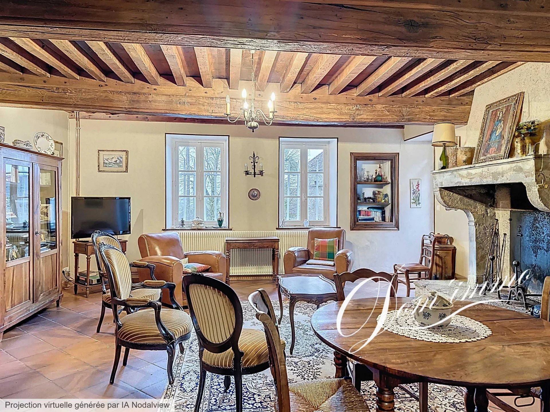 un séjour chaleureux ouvrant sur une terrasse, agrémenté d’une cheminée bourguignonne à foyer ouvert, d’un plafond à la française et d'un sol carreaux de grès,