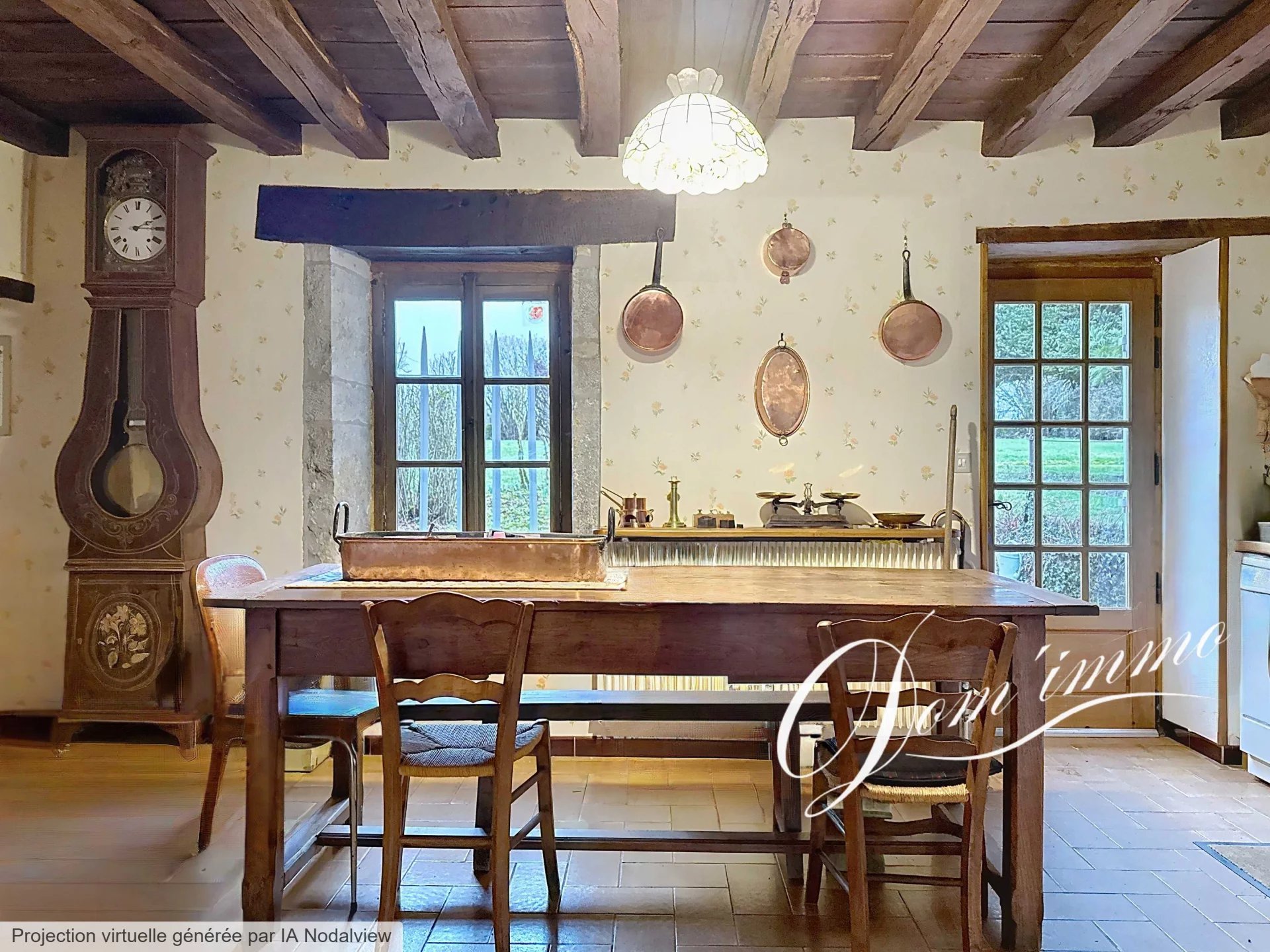 une cuisine aménagée attenante dotée d’un plafond à poutres apparentes, d’un sol carrelé, bénéficie d’un accès direct au jardin ainsi qu’à un local à usage de réserve, à la suite salle à manger lumineuse en double exposition, est-ouest, ouverte sur une terrasse et jardin, dotée d’une cheminée en pierre de Comblanchien.