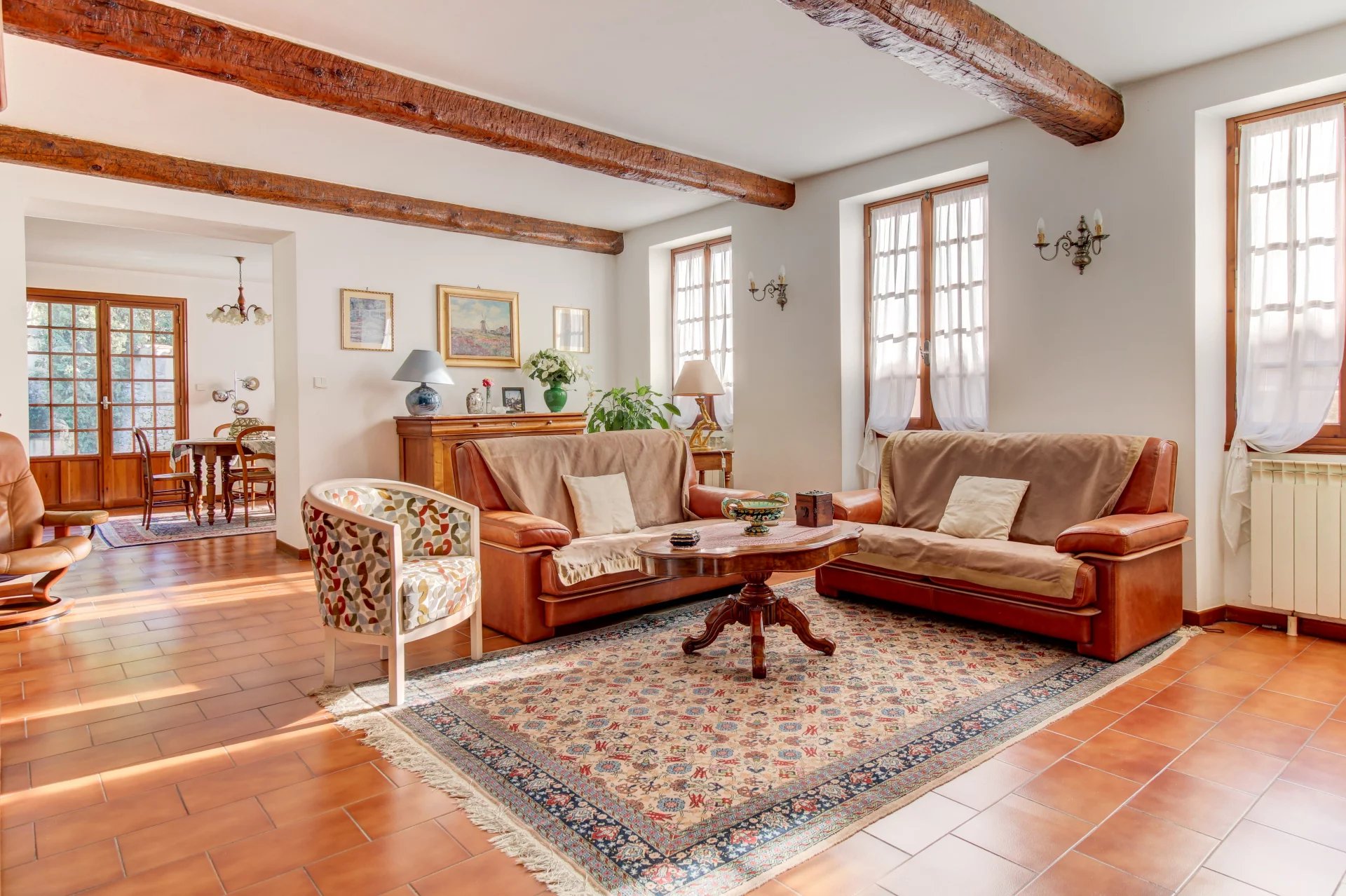 L’intérieur offre une atmosphère chaleureuse et lumineuse. Les espaces de vie s’articulent autour d’un vaste séjour, d’un salon climatisé avec cheminée à insert et d’une cuisine accueillante, le tout en lien direct avec les terrasses et le jardin. La circulation est fluide, les volumes sont agréables et la maison respire l’authenticité.