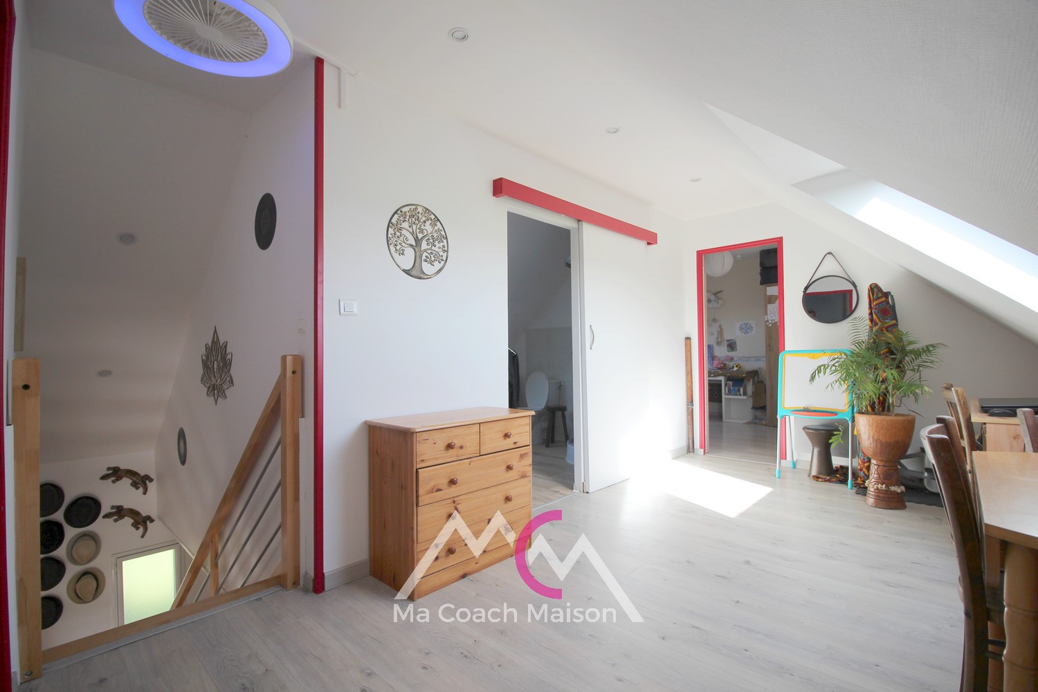 À l'étage, une agréable mezzanine créée un espace supplémentaire idéal pour un bureau ou un espace détente, et dessert deux chambres avec rangements, ainsi qu'une salle d'eau avec wc.