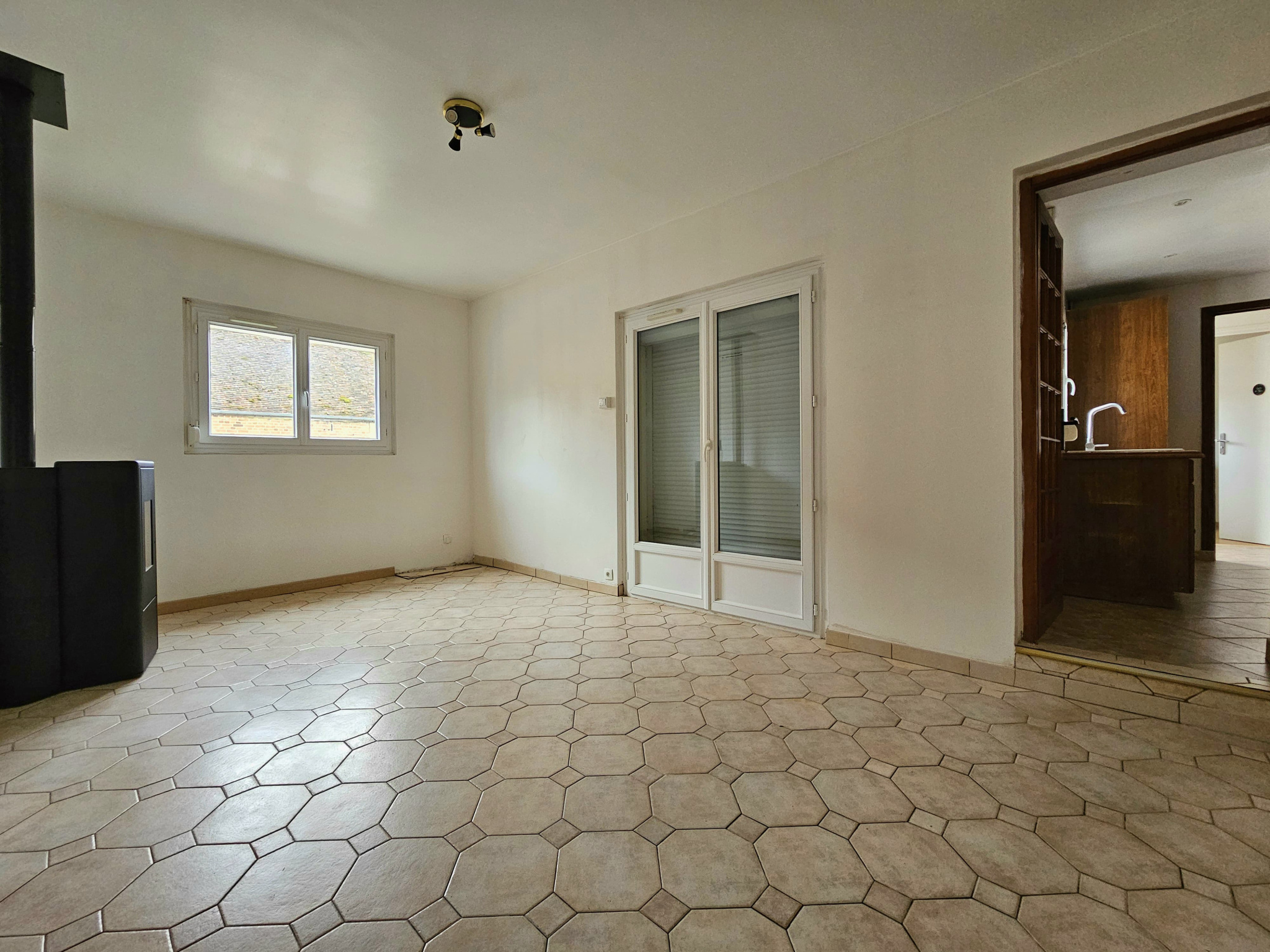 au rez-de-chaussée : une entrée, un séjour/salon avec poêle, une cuisine indépendante aménagée et équipée, une chambre avec placard, une salle d'eau, un wc séparé.